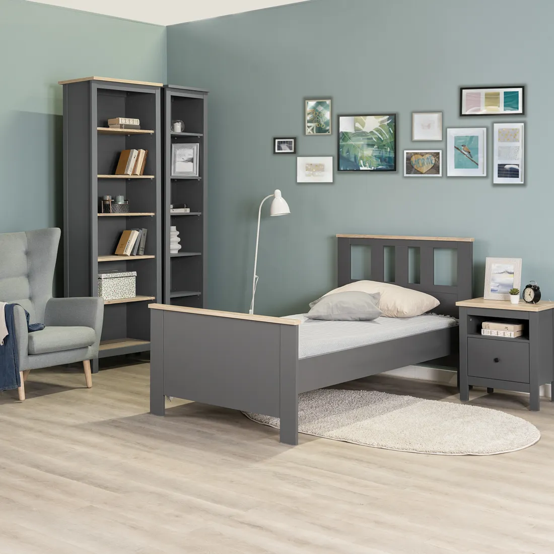 —2.08.04.050.15 САГА кровать одинарная 90х200 серая/ясень
