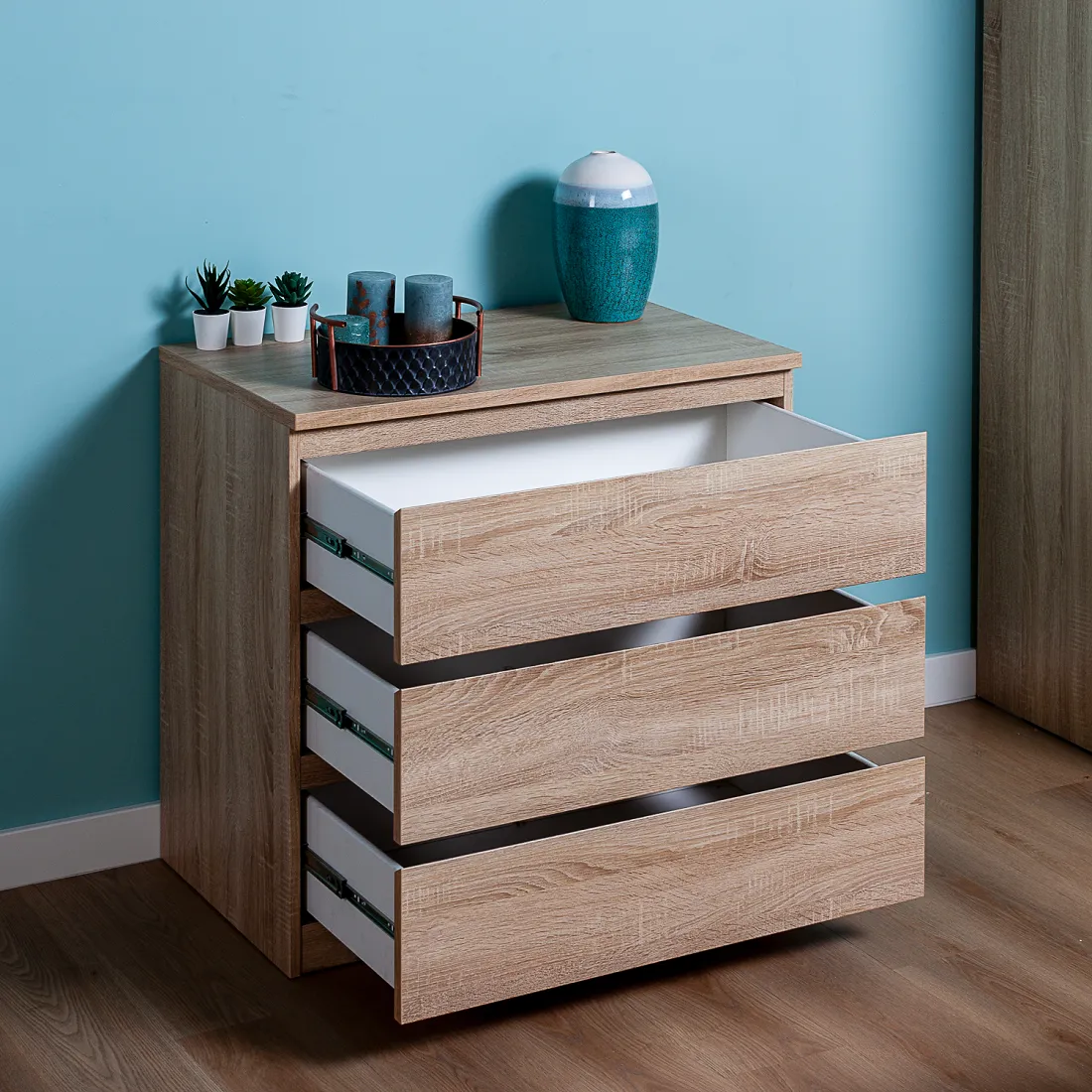 Комод МАЛЬТА с тремя выдвижными ящиками, 803х480х764, цвет Дуб Сонома. Крепится к стене. Гарантийный срок для жилых помещений 24 месяца, для общественных помещений - 18 месяцев.