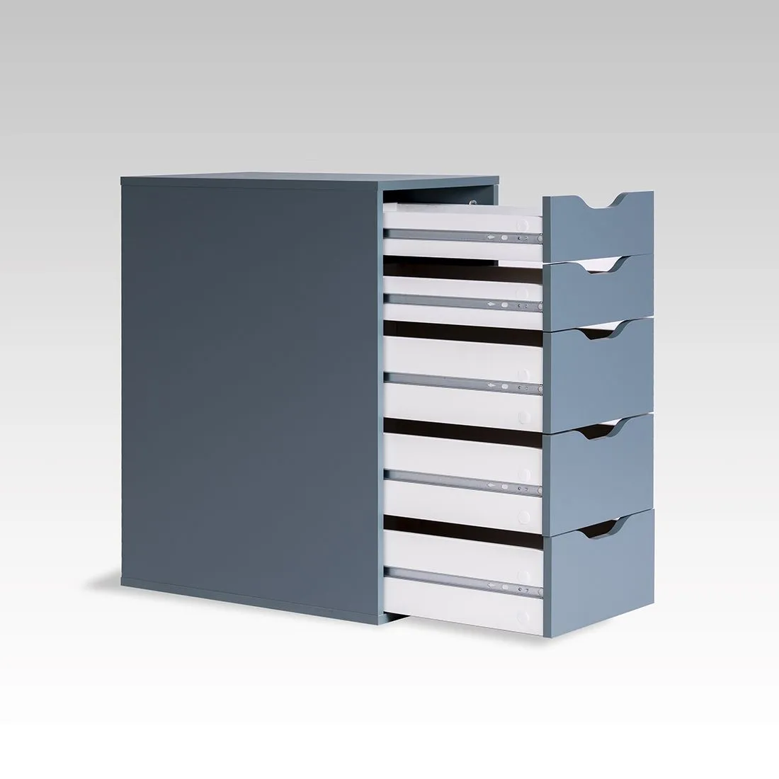 Комод Ингар 5, 36х71х53, цвет серо-бирюзовый. Узкий комод с пятью выдвижными ящиками. Конструкция: ДСП, поверхность, декорированная бумага, окраска УФ материалами. Фасады ящиков без ручек, с вырезами для удобного выдвижения. Ящики переменной высоты позволяют использовать их для хранения разнообразных предметов. Гарантийный срок для жилых и общественных помещений 24 месяца.