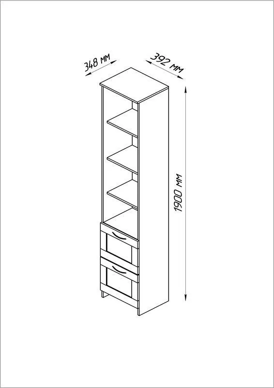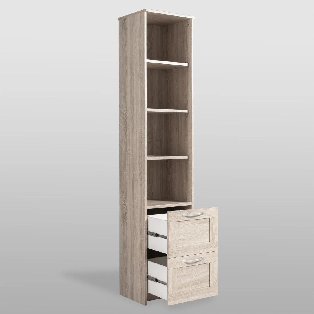 Стеллаж СИРИУС узкий с четырьмя полками сверху и двумя выдвижными ящиками снизу, 392х348х1900, цвет Дуб Сонома. Изготовлен из кашированного ДСП толщиной 16 мм. Крепится к стене. Гарантийный срок для жилых помещений 24 месяца, для общественных помещений - 18 месяцев.