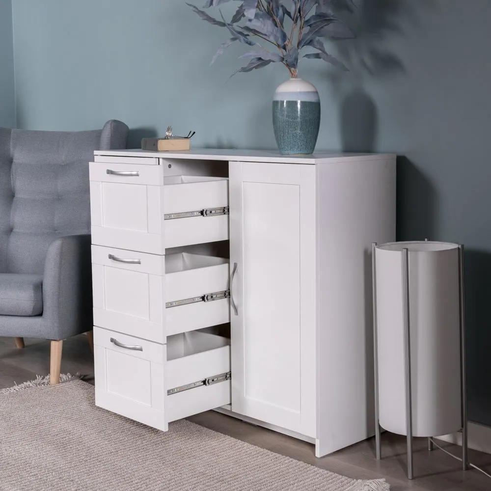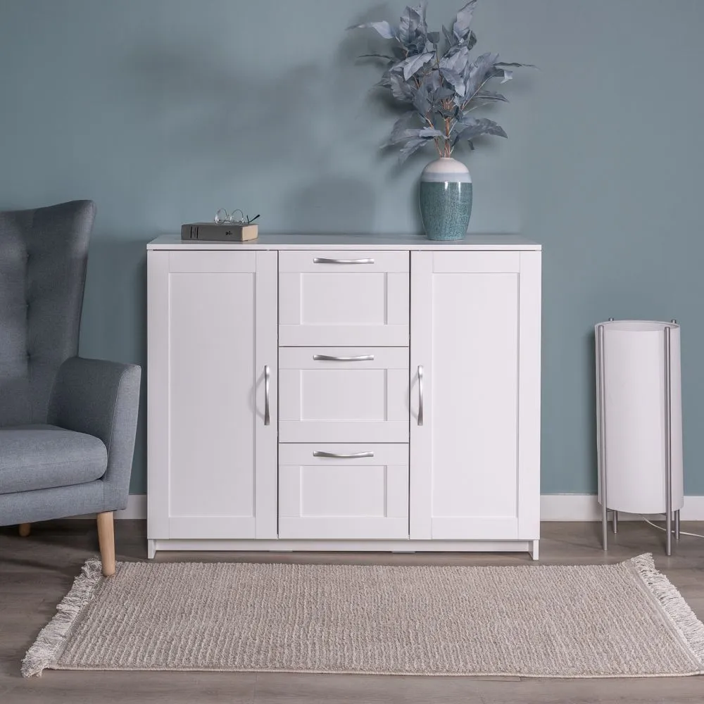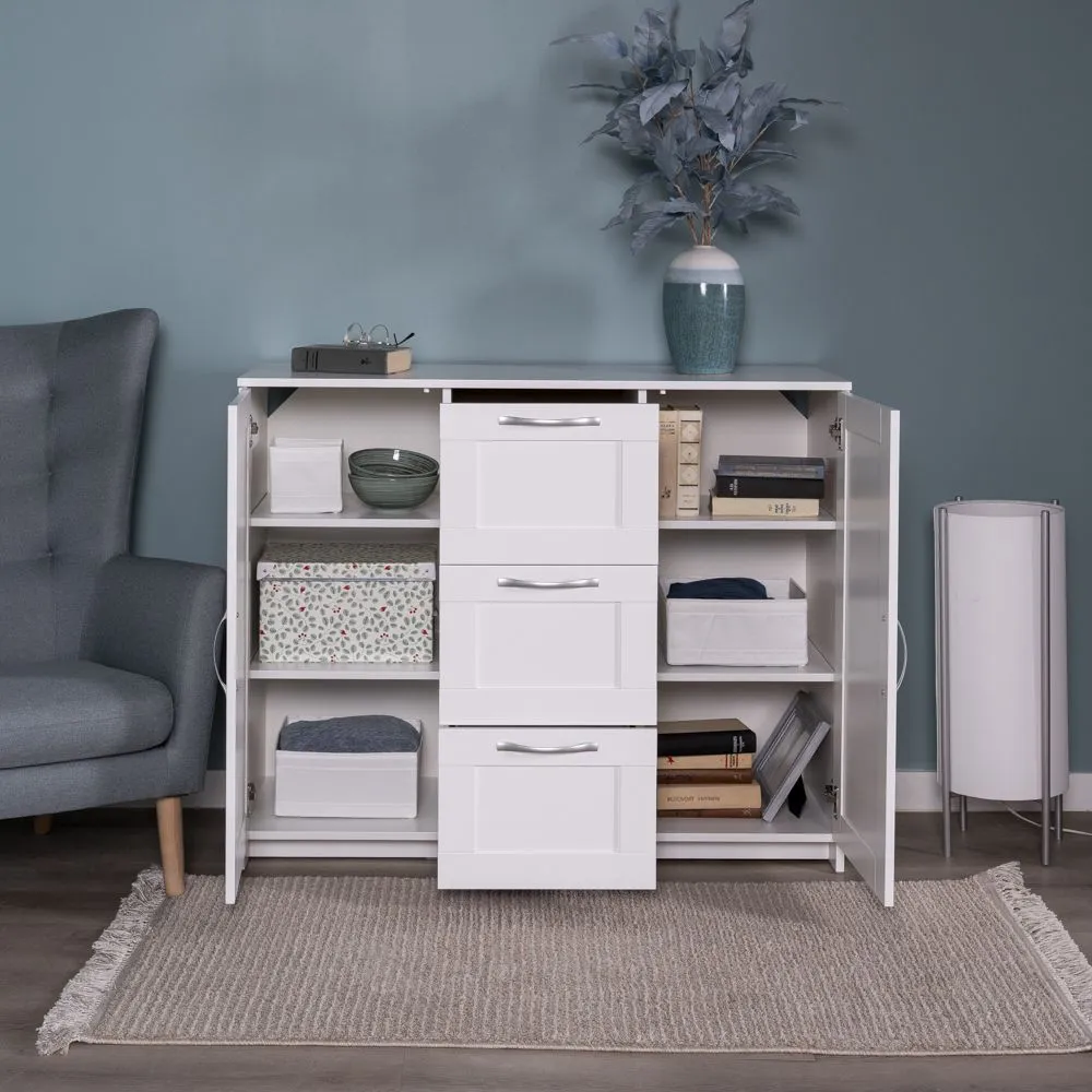 Тумба СИРИУС двухдверная с тремя наружными выдвижными ящиками, 1171х412х946, цвет Белый. Изготовлена из кашированного ДСП толщиной 16 мм. Крепится к стене. Гарантийный срок для жилых помещений 24 месяца, для общественных помещений - 18 месяцев.