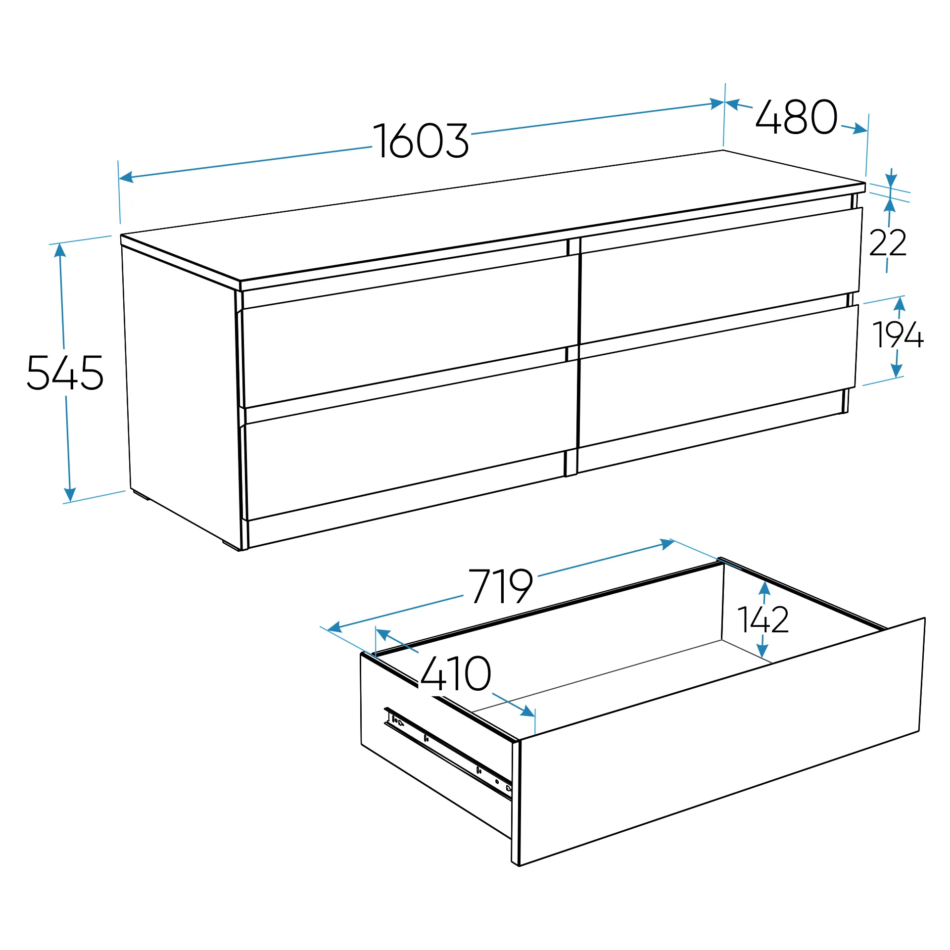 Комод МАЛЬТА с четырьмя выдвижными ящиками, 1603х480х540, цвет Дуб Венге. Крепится к стене. Гарантийный срок для жилых помещений 24 месяца, для общественных помещений - 18 месяцев.