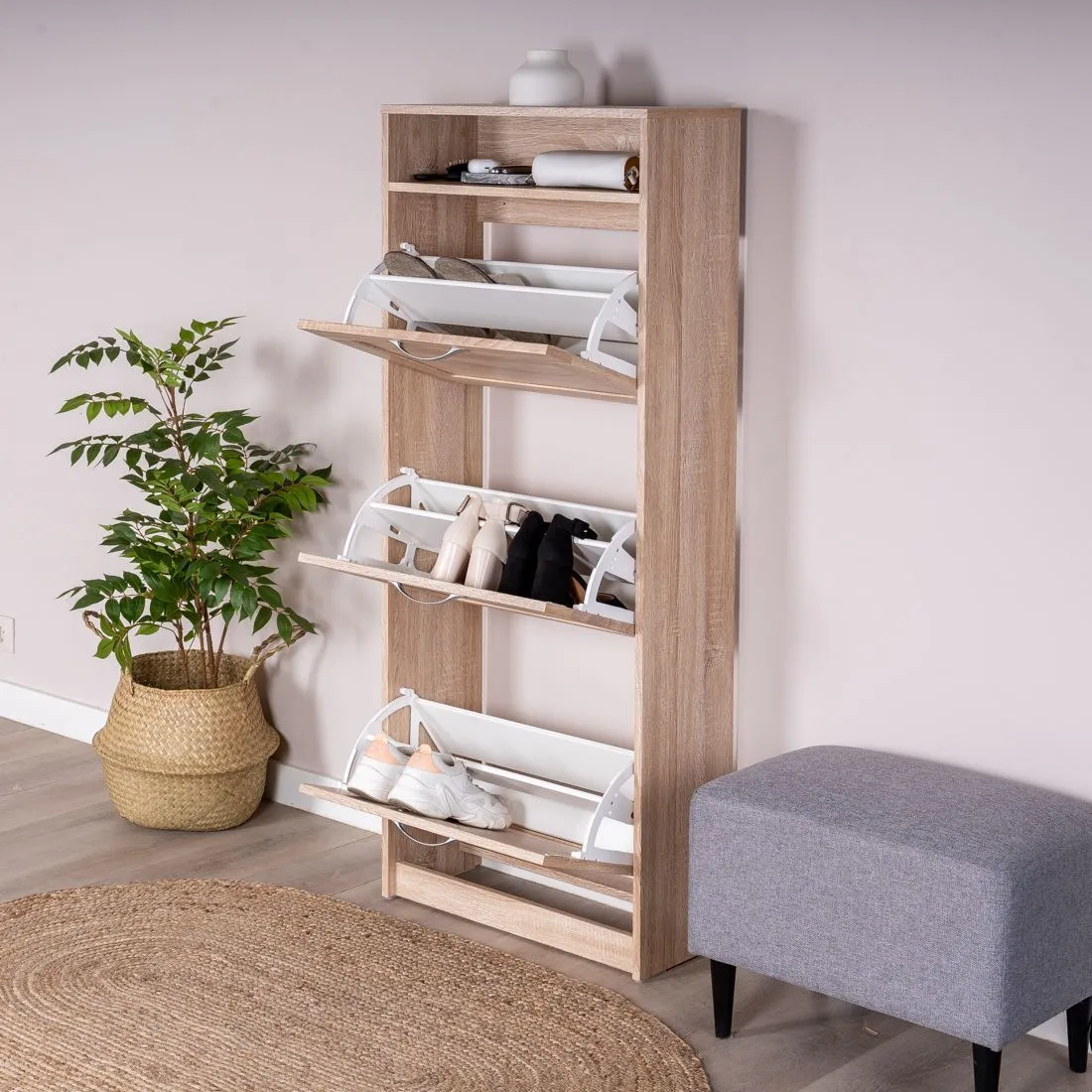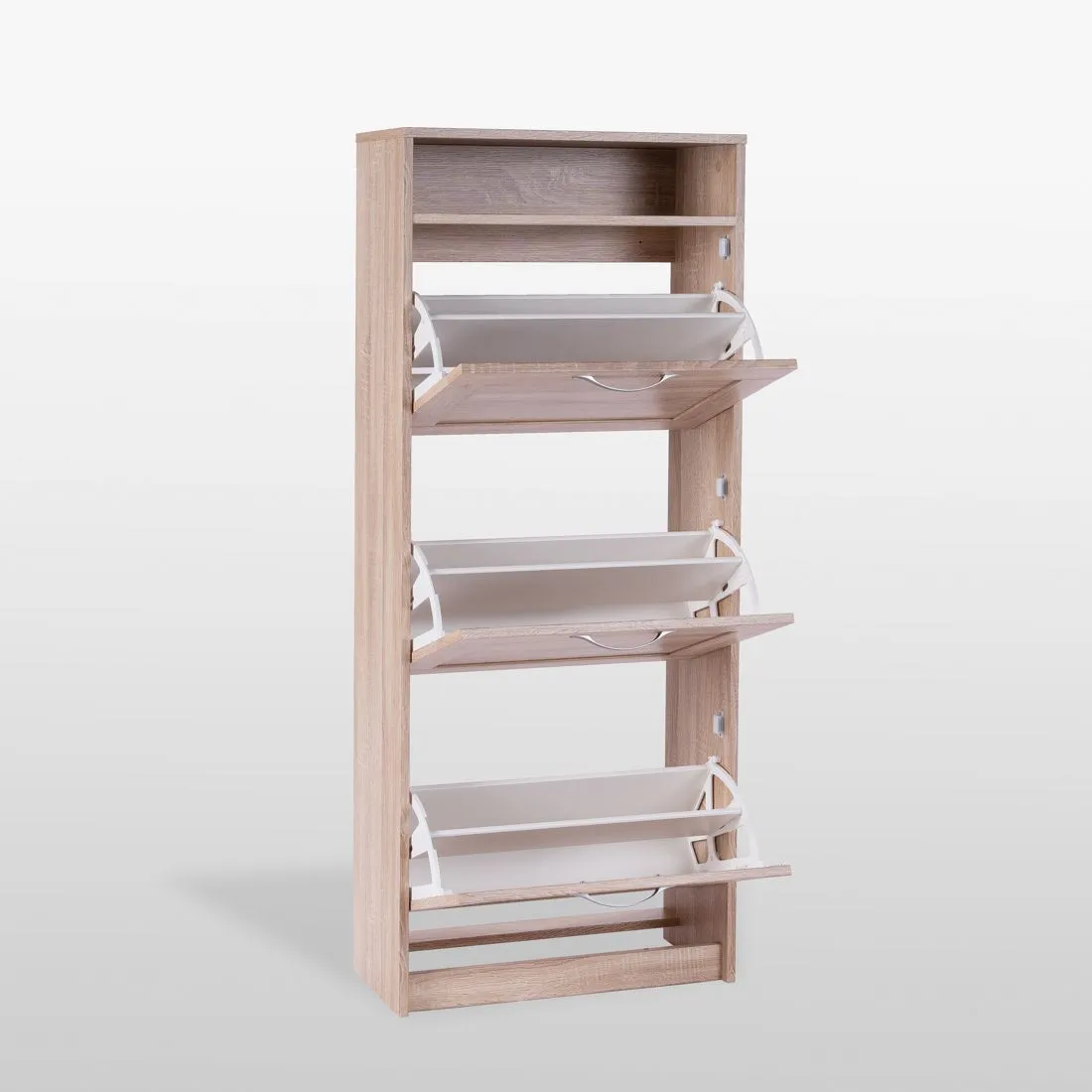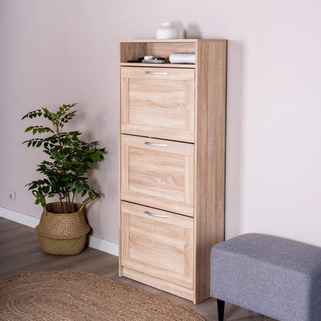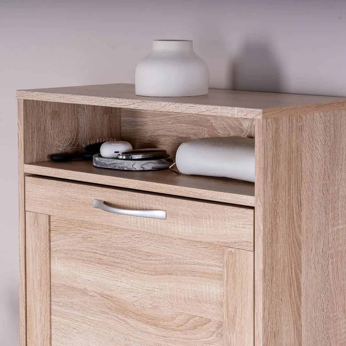 Тумба СИРИУС с нишей и тремя откидными полками для обуви, 602х250х488, цвет Дуб Сонома. Изготовлена из кашированного ДСП толщиной 16 мм. Крепится к стене. Гарантийный срок для жилых помещений 24 месяца, для общественных помещений - 18 месяцев.
