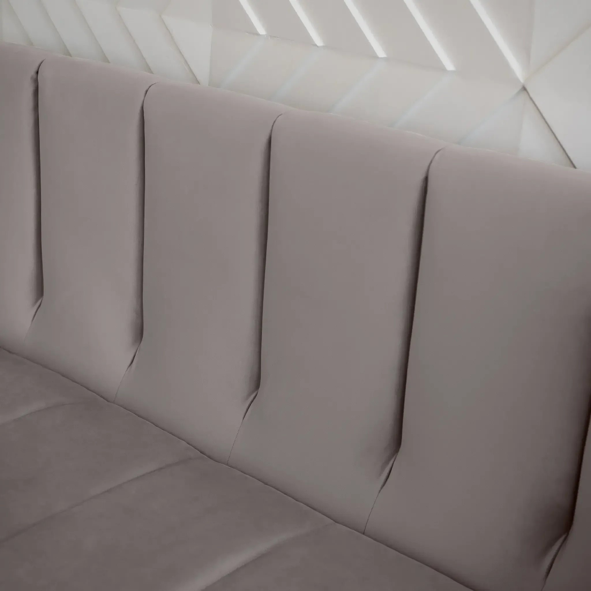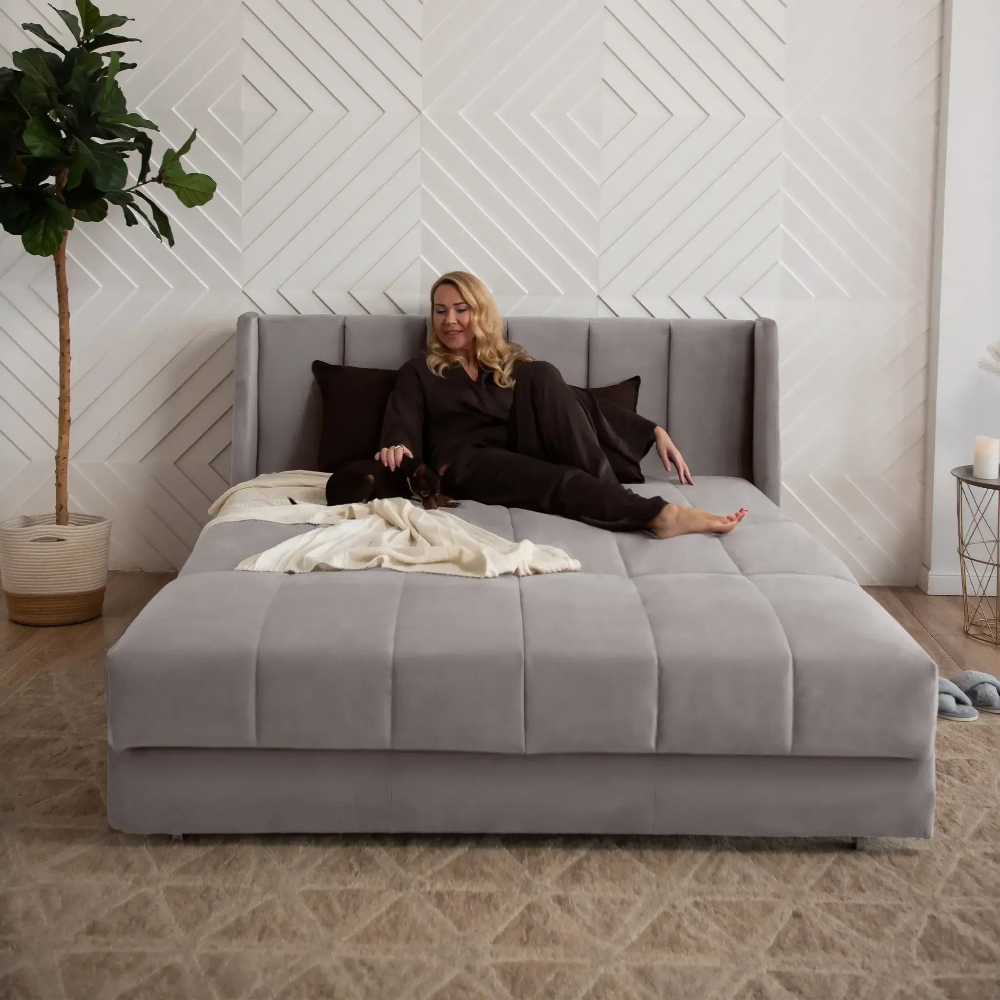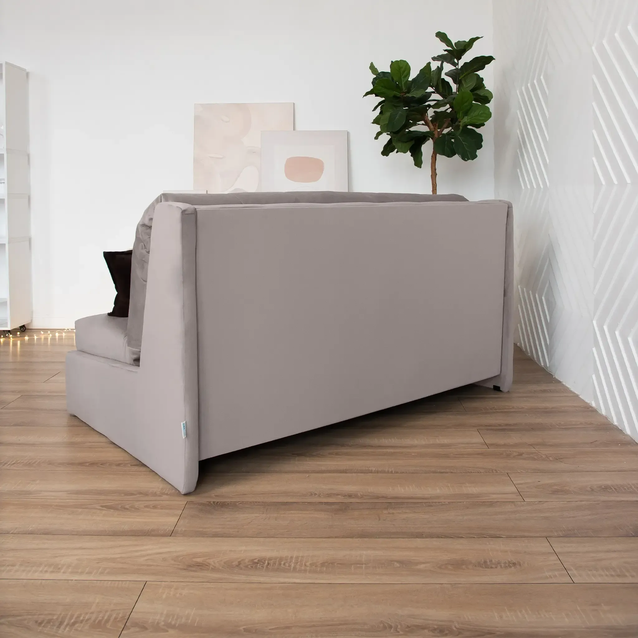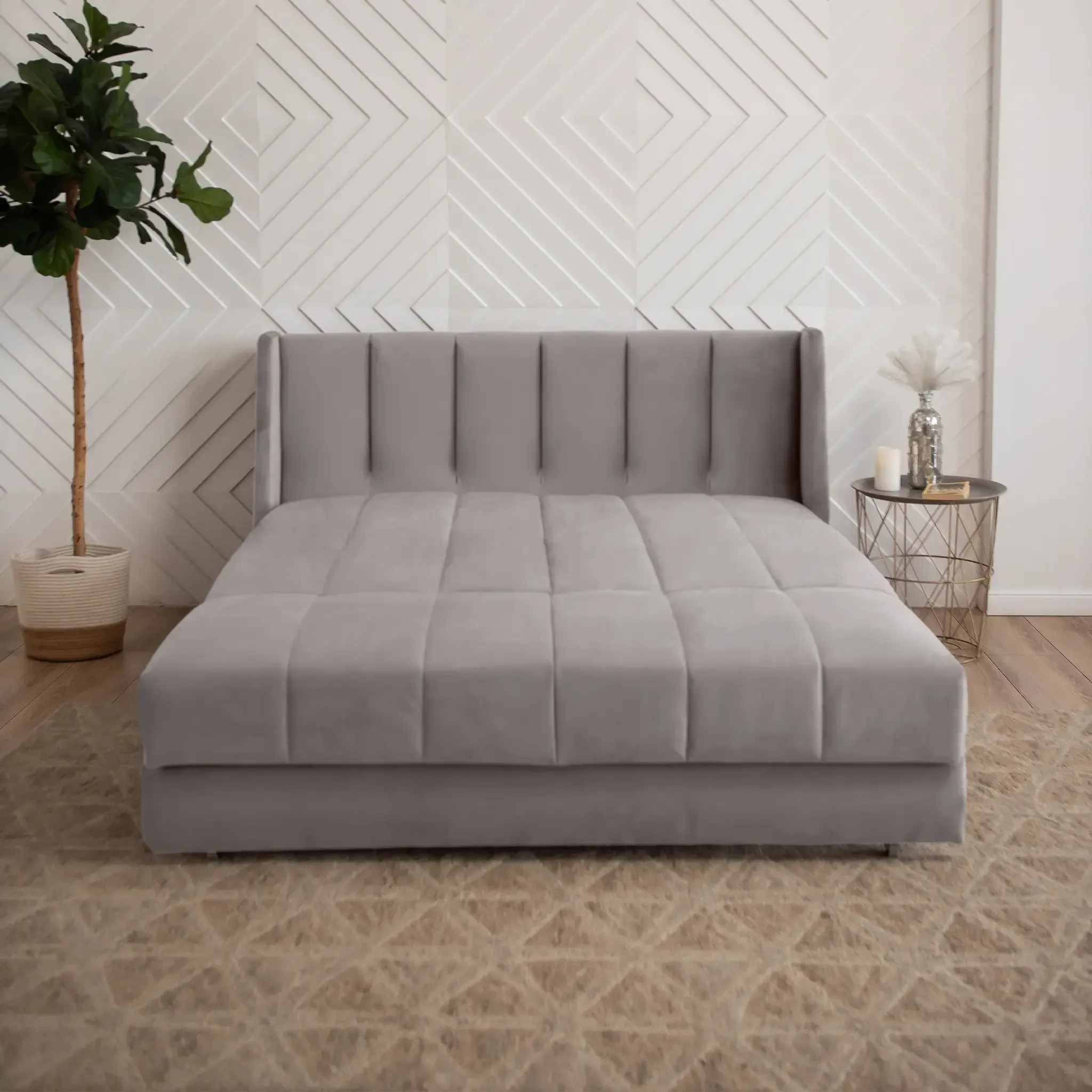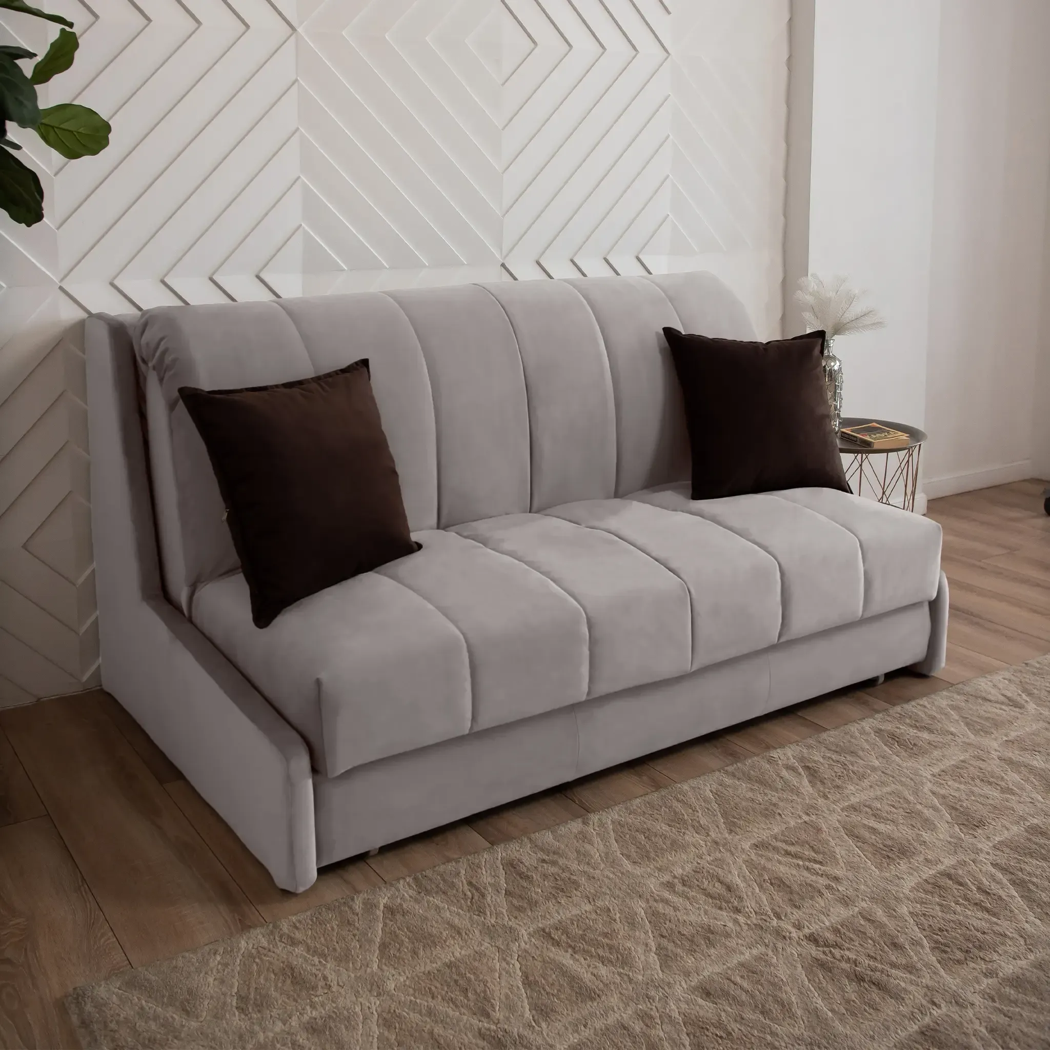 Эстетика дизайна. Высокая спинка с вертикальными утяжками делает складную кровать стильной деталью интерьера. А спинка в основной ткани позволяет использовать её для зонирования пространства.