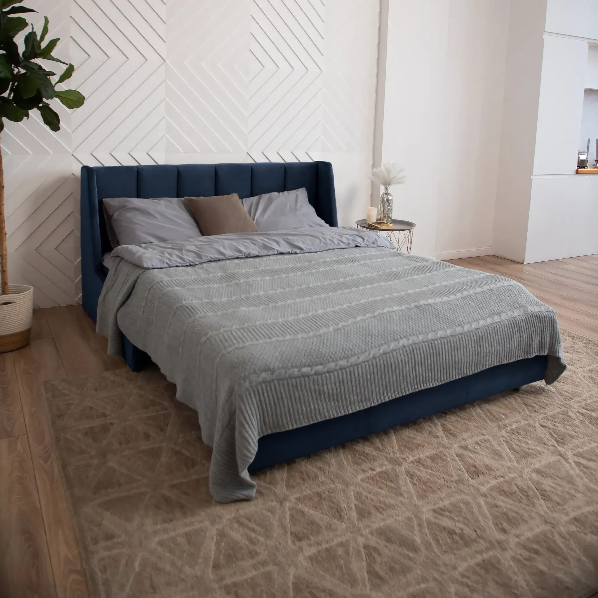 Эстетика дизайна. Высокая спинка с вертикальными утяжками делает складную кровать стильной деталью интерьера. А спинка в основной ткани позволяет использовать её для зонирования пространства.