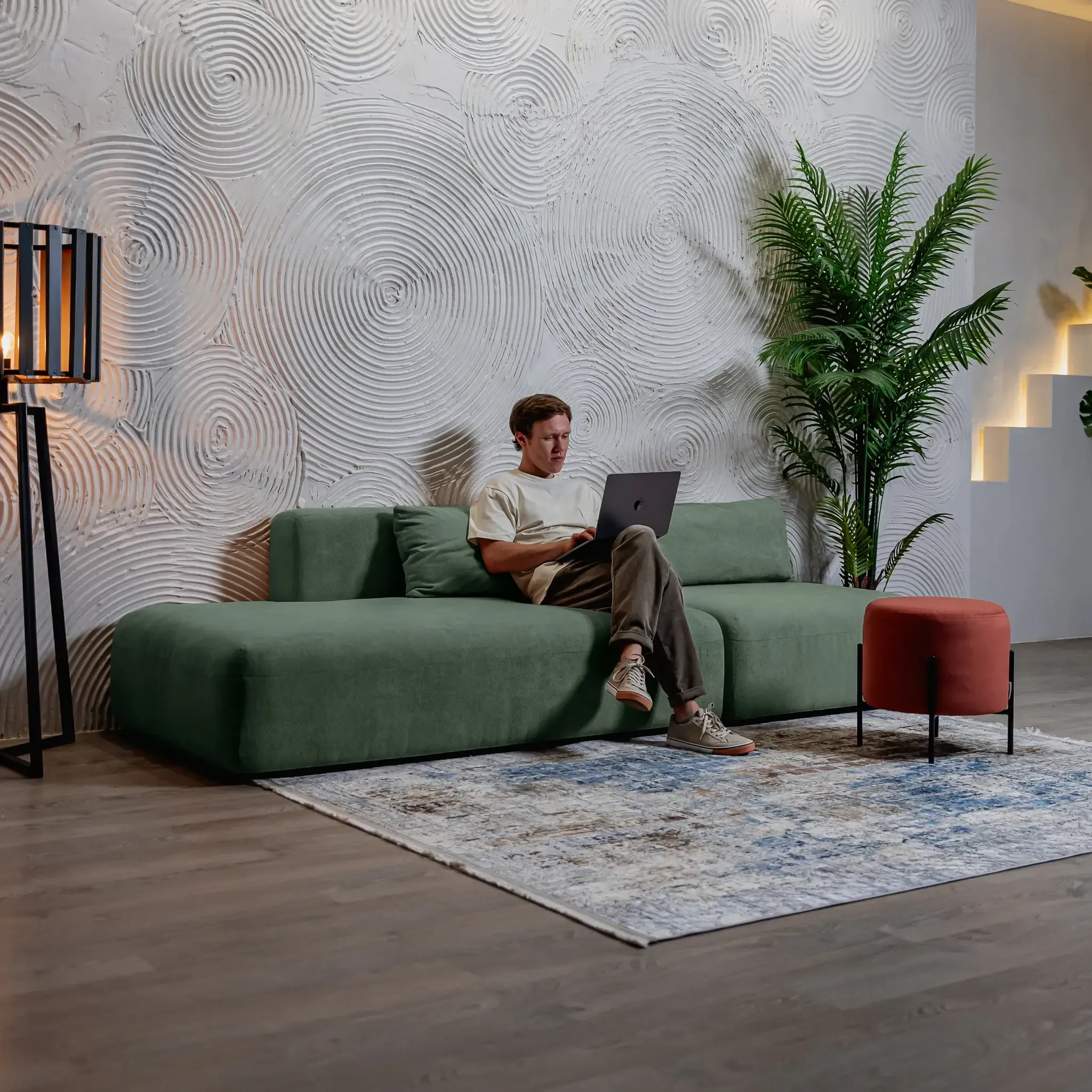 Дизайн дивана выполнен в современном стиле, который подойдет для интерьеров в стиле джапанди и минимализм. Округлые формы и широкие подлокотники создают ощущение уюта и комфорта. Вытянутые в горизонталь летящие силуэты дивана и асимметрия придают ему современное обличие.