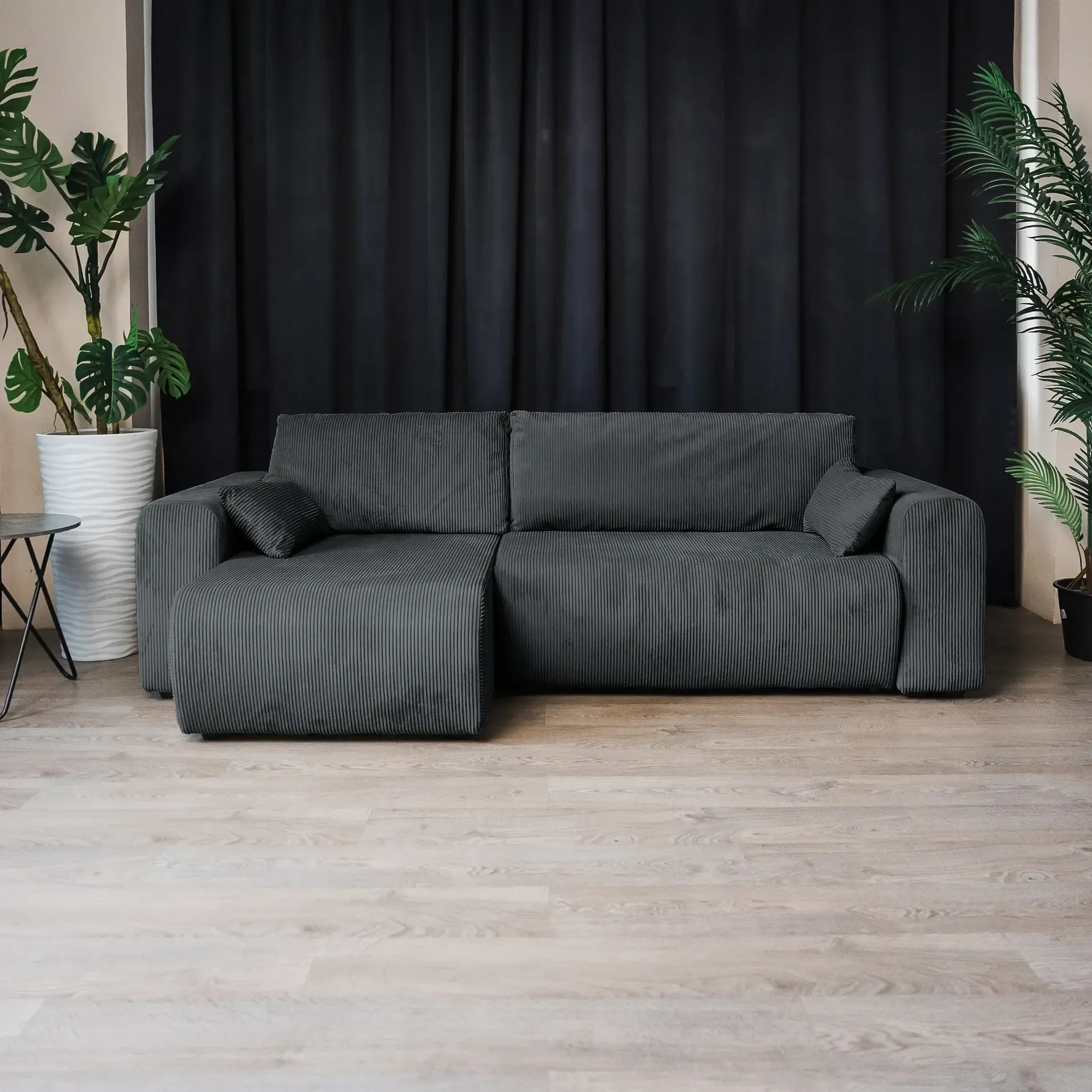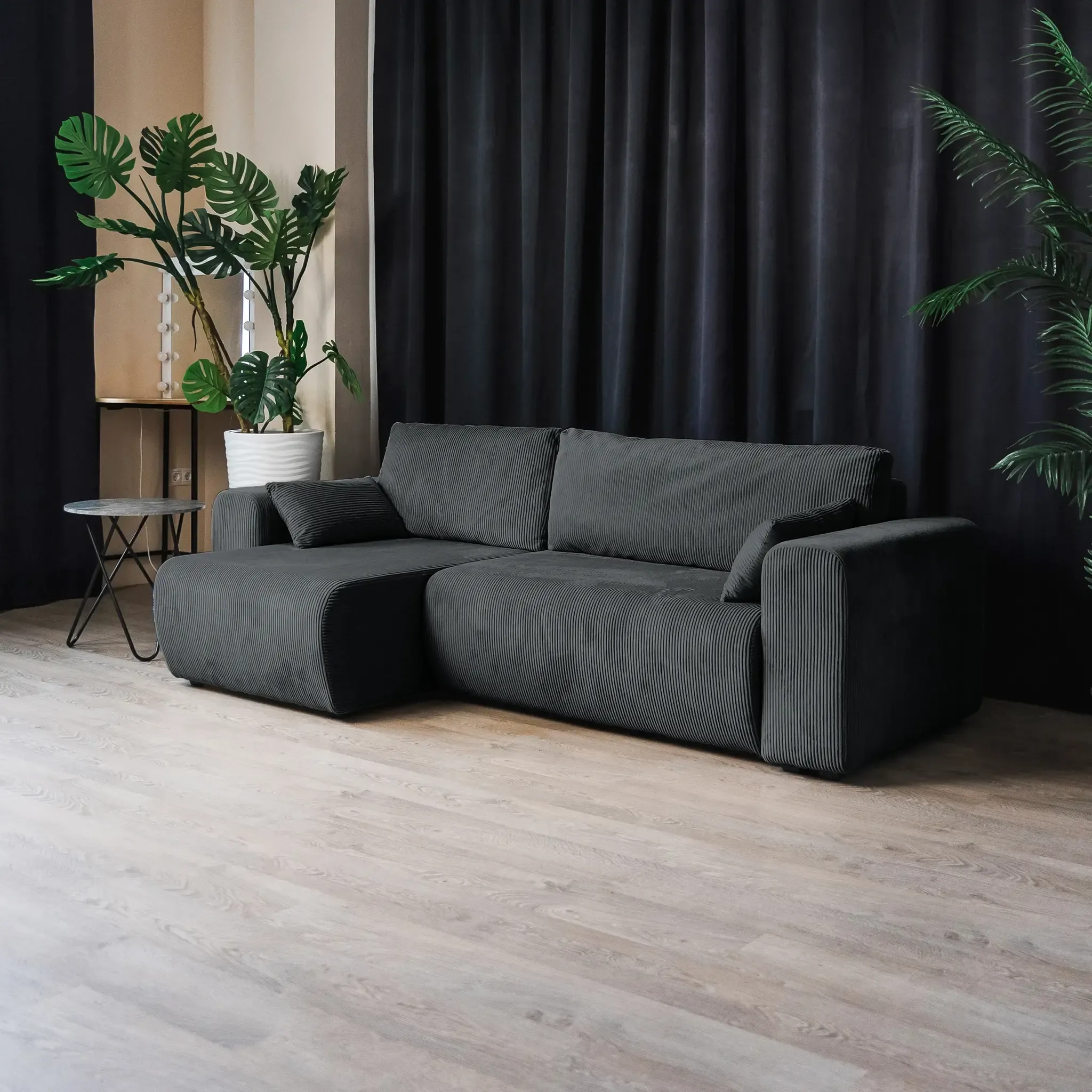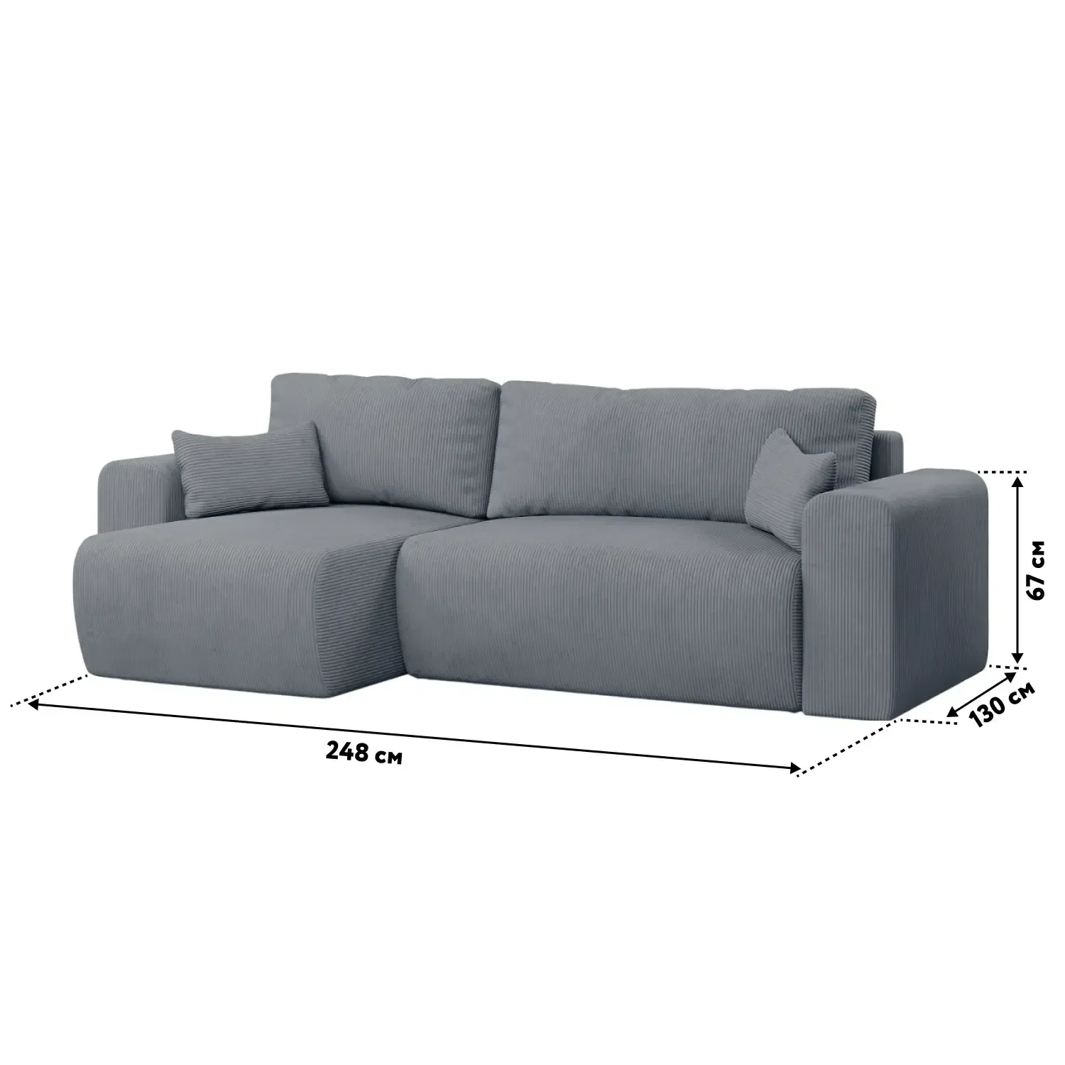 Универсальный угол дивана позволяет адаптировать его под любую планировку комнаты, а мягкий велюр CILIUM с рельефной фактурой добавляет интерьеру уюта и изысканности. Базовая обивка спинки делает диван универсальным элементом зонирования, создавая уютные уголки для отдыха или общения. В комплекте с диваном вы получаете набор стильных декоративных подушек.