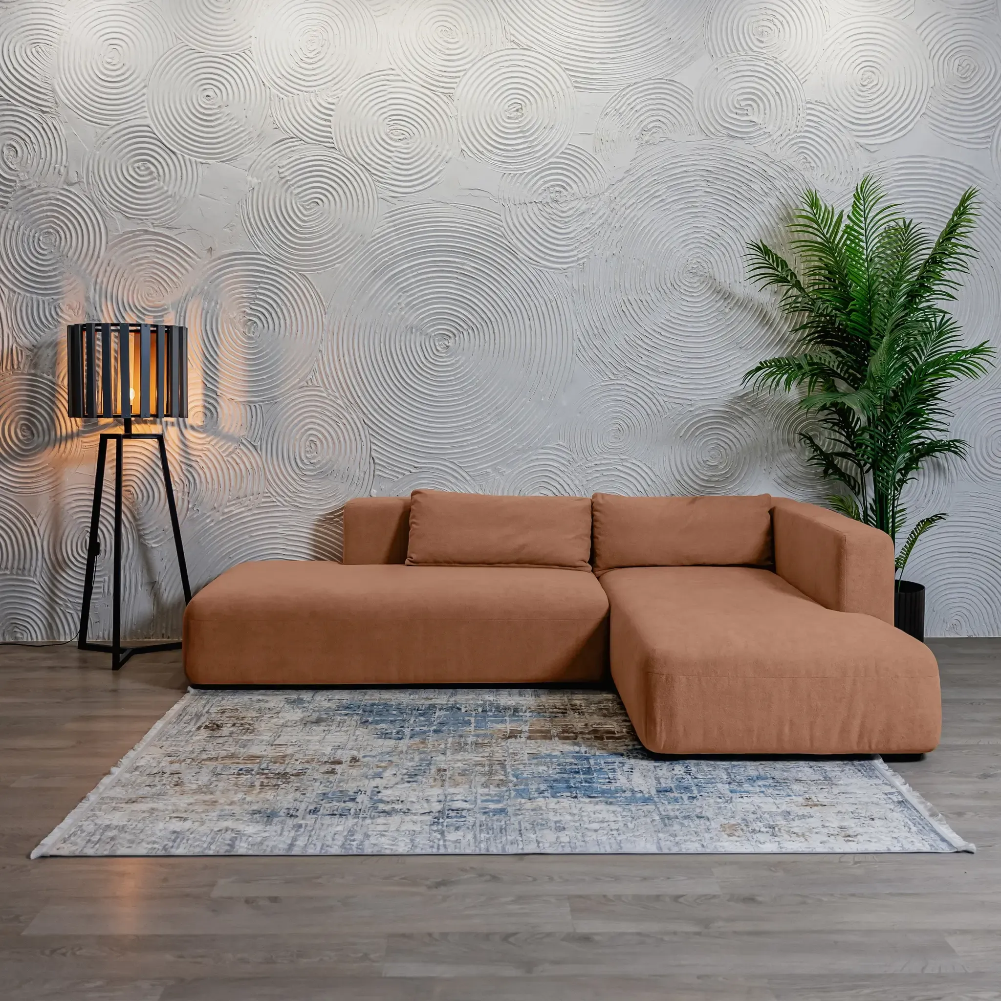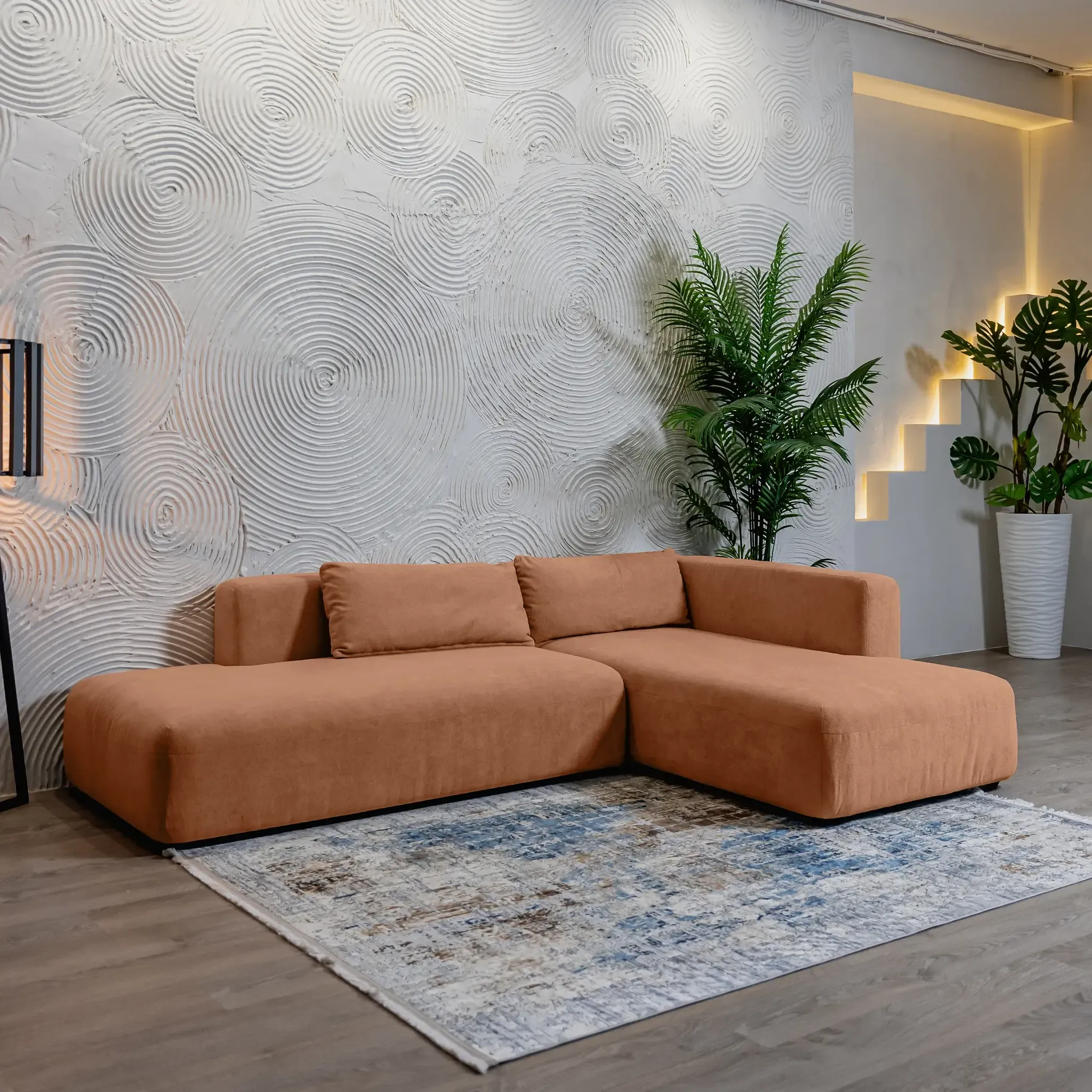 Дизайн дивана выполнен в современном стиле, который подойдет для интерьеров в стиле джапанди и минимализм. Округлые формы и широкие подлокотники создают ощущение уюта и комфорта. Вытянутые в горизонталь летящие силуэты дивана и асимметрия придают ему современное обличие.