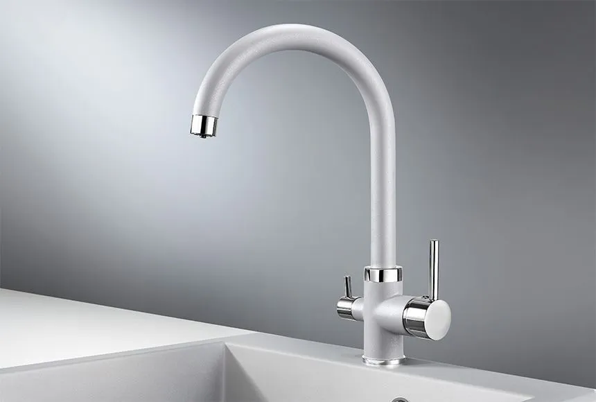 Смеситель для кухонной мойки Granula 2168 изготовлен из высококачественного материала. Латунный корпус обеспечивает длительный срок службы. При этом высокий излив позволяет мыть как мелкую, так и крупногабаритную посуду. Двухрычажная модель смесителя Granula 2168 выполнена с краном для питьевой воды. Фильтрованная вода подается по отдельной трубке и не смешивается с водопроводной водой. Покупателям предлагаются различные типы смесителей, окрашенные в тон моек Granula и StandART.Все модели смесителей для кухонных моек во всех цветах Вы можете посмотреть и приобрести на нашем сайте или в наших представительствах в регионах.Если у Вас остались вопросы, обращайтесь к нашим консультантам.