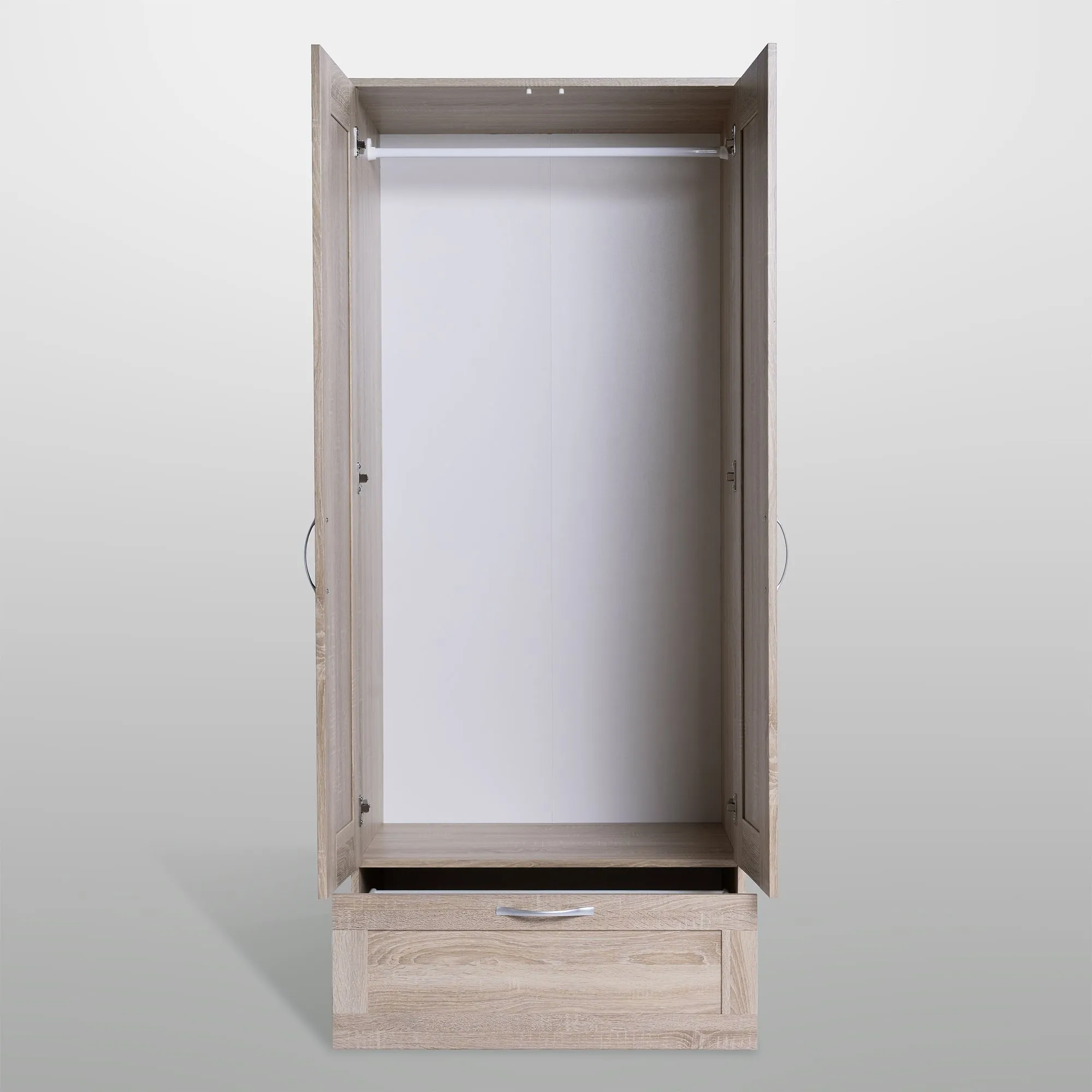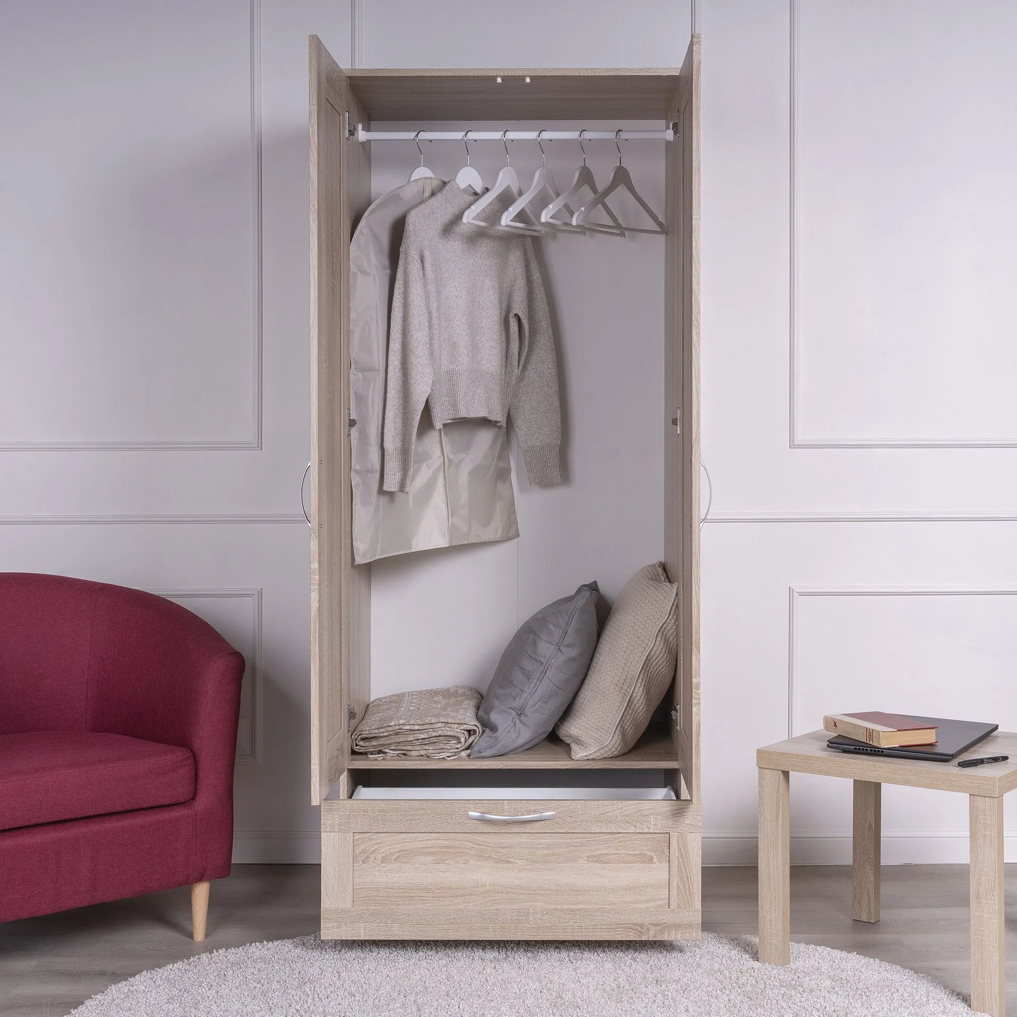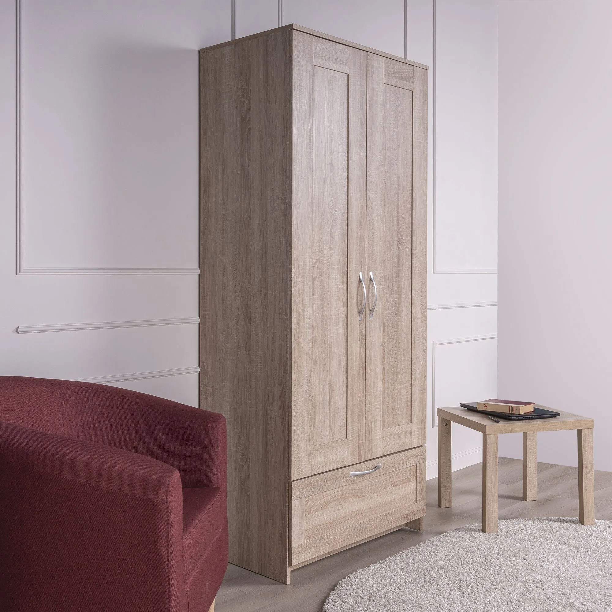 Шкаф СИРИУС для одежды двухдверный, с выдвижным ящиком, 782х502х1900, цвет Дуб Сонома. Изготовлен из кашированного ДСП толщиной 16 мм. Крепится к стене. Гарантийный срок для жилых помещений 24 месяца, для общественных помещений - 18 месяцев.