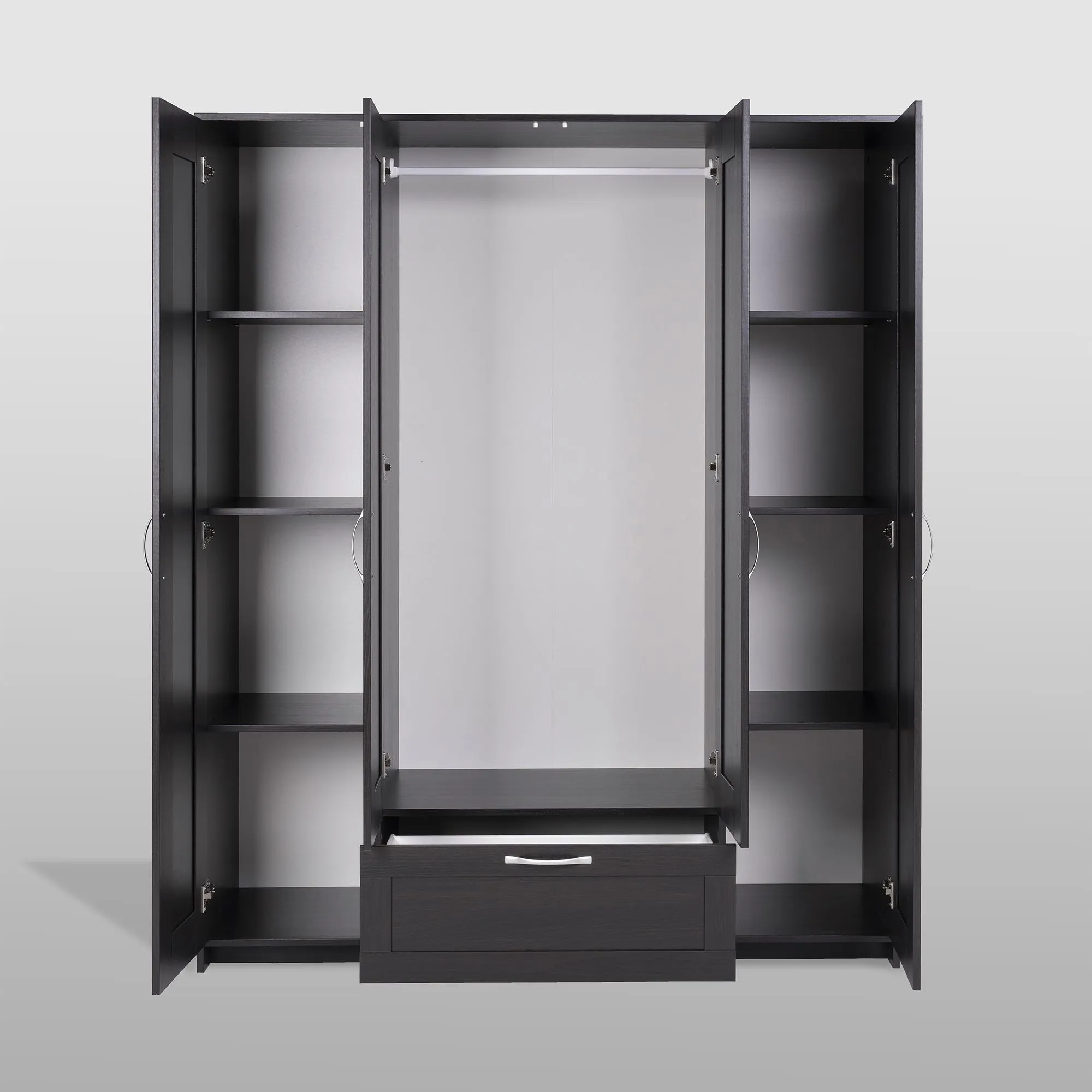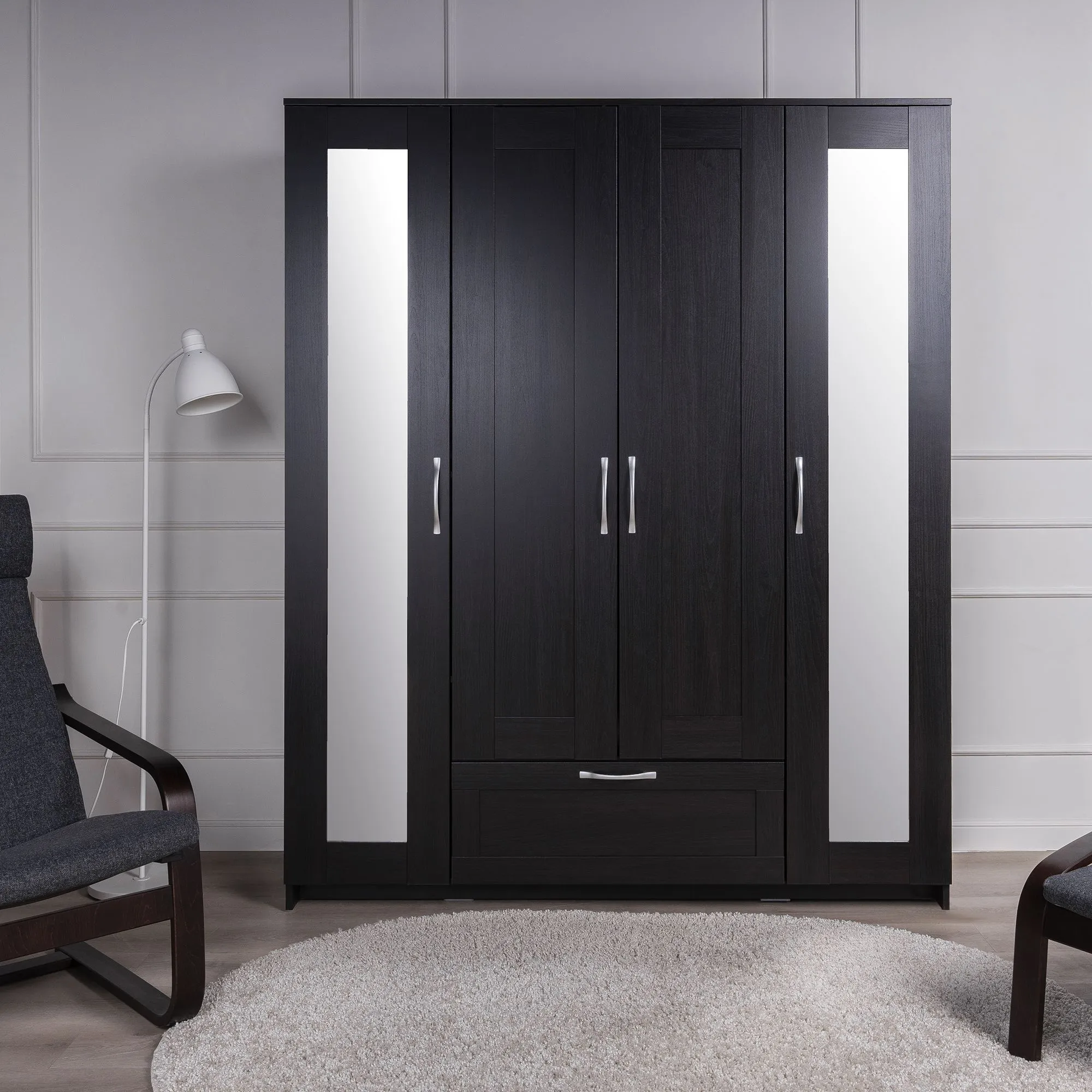 Шкаф СИРИУС комбинированный для одежды четырехдверный, с одним выдвижным ящиком и двумя зеркалами, 1561х502х1900, цвет Дуб Венге. Изготовлен из кашированного ДСП толщиной 16 мм. Крепится к стене. Гарантийный срок для жилых помещений 24 месяца, для общественных помещений - 18 месяцев.