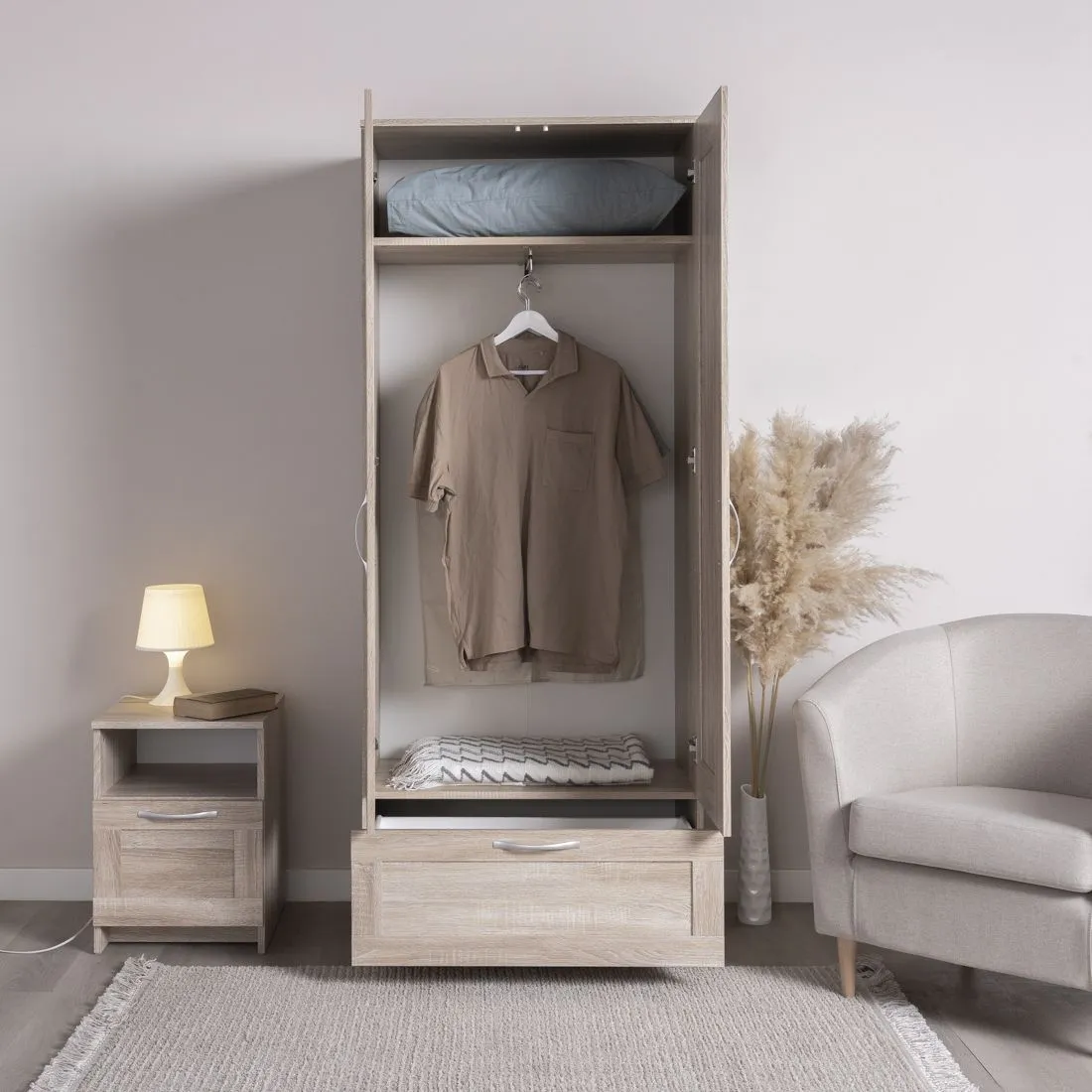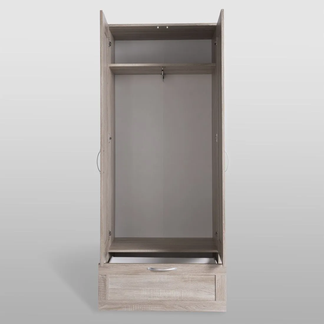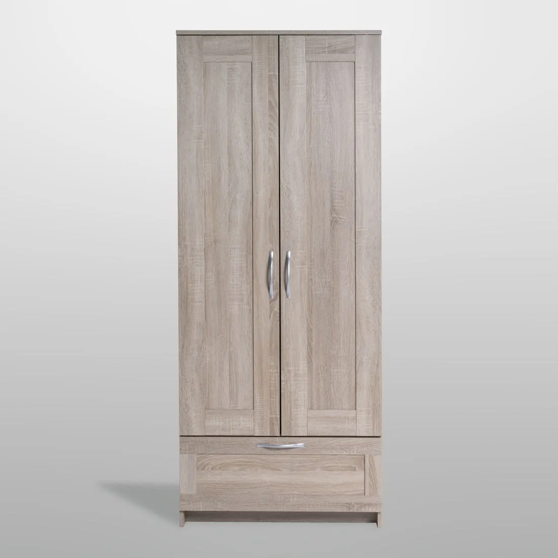 Шкаф СИРИУС для одежды двухдверный, с выдвижным ящиком, 782х412х1900, цвет Дуб Сонома. Изготовлен из кашированного ДСП толщиной 16 мм. Крепится к стене. Гарантийный срок для жилых помещений 24 месяца, для общественных помещений - 18 месяцев.