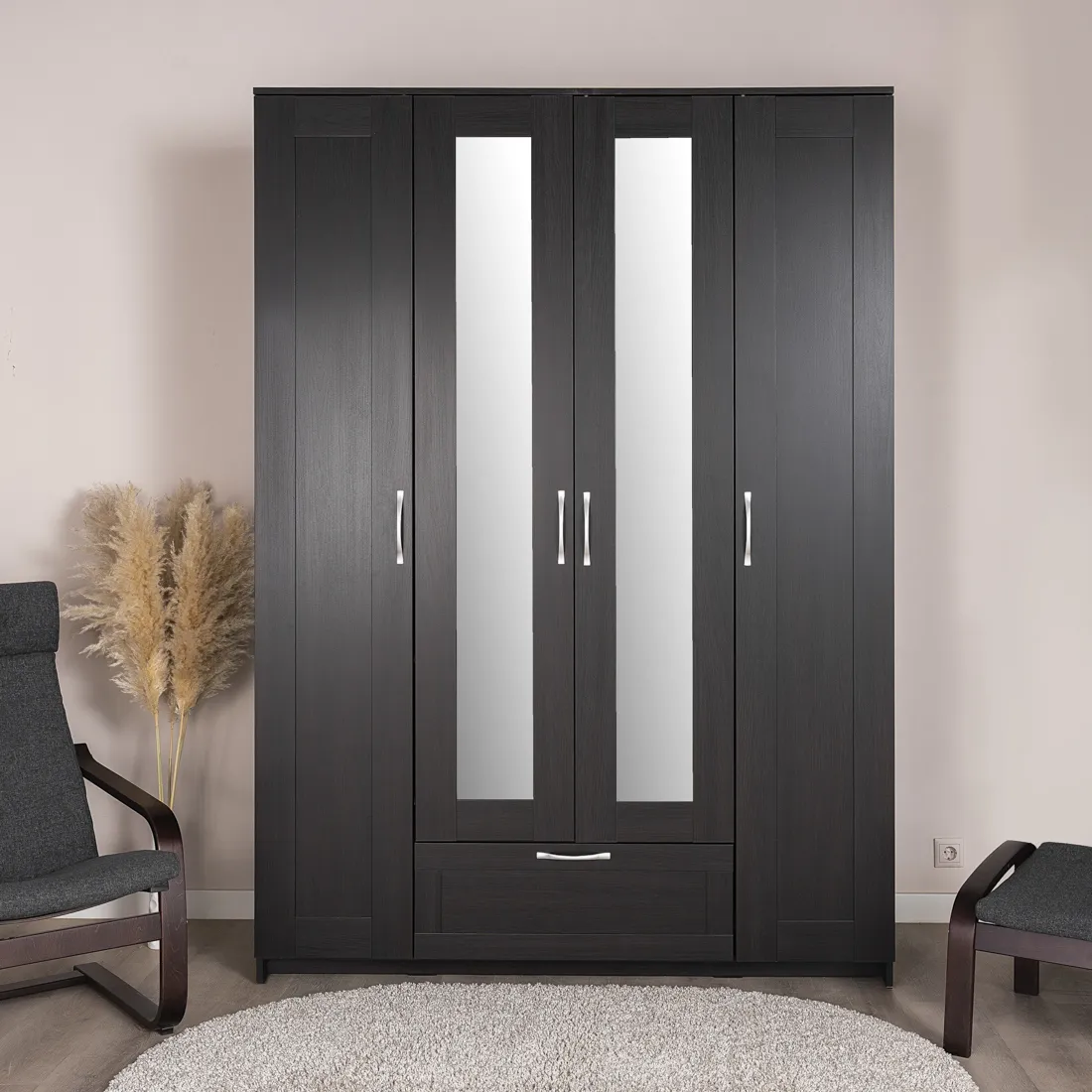 Шкаф СИРИУС комбинированный для одежды четырехдверный, с выдвижным ящиком и двумя зеркалами, 1560х585х2196, цвет Дуб Венге. Изготовлен из кашированного ДСП толщиной 16 мм. Крепится к стене. Гарантийный срок для жилых помещений 24 месяца, для общественных помещений - 18 месяцев.