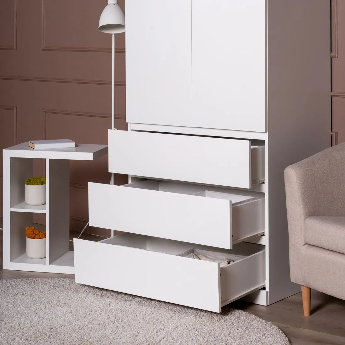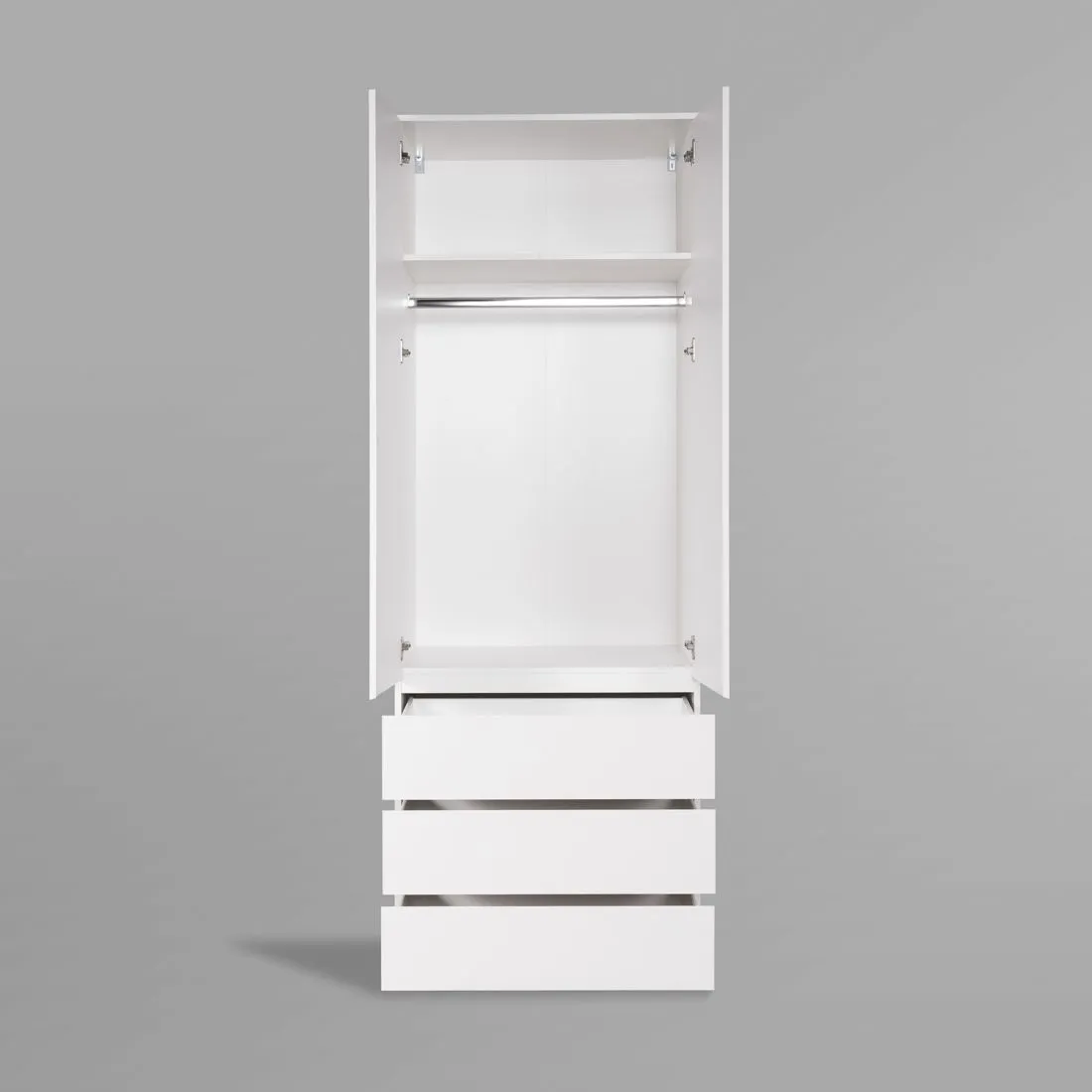 Шкаф Варма Стор 80: вместительный шкаф шириной 800 мм из серии шкафов ВАРМА СТОР. Выполнен в классическом строгом белом дизайне с ручками скрытого типа. 2 распашных фасада и 3 выдвижных ящика, оснащен гардеробной штангой.