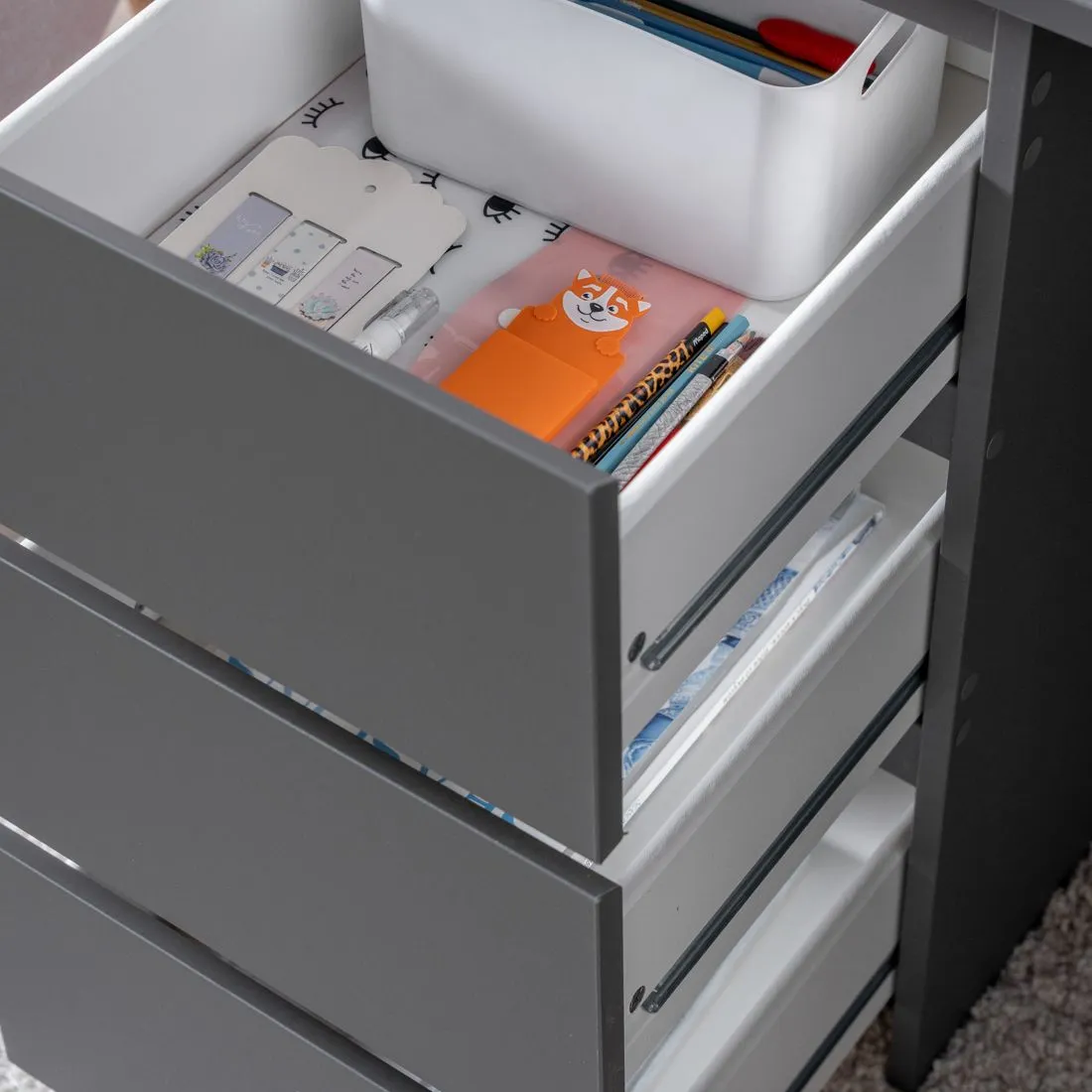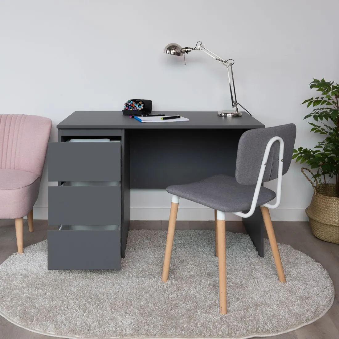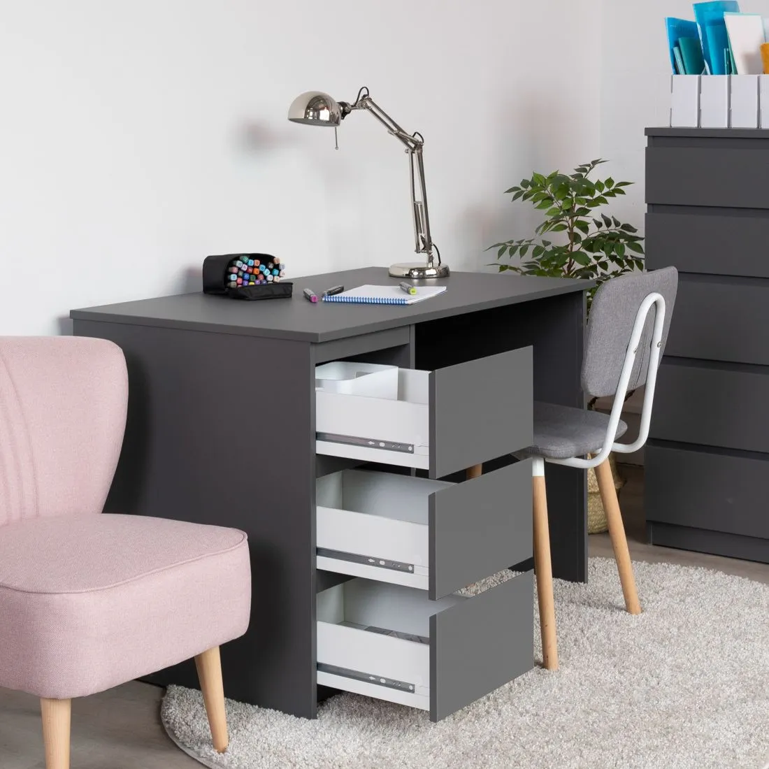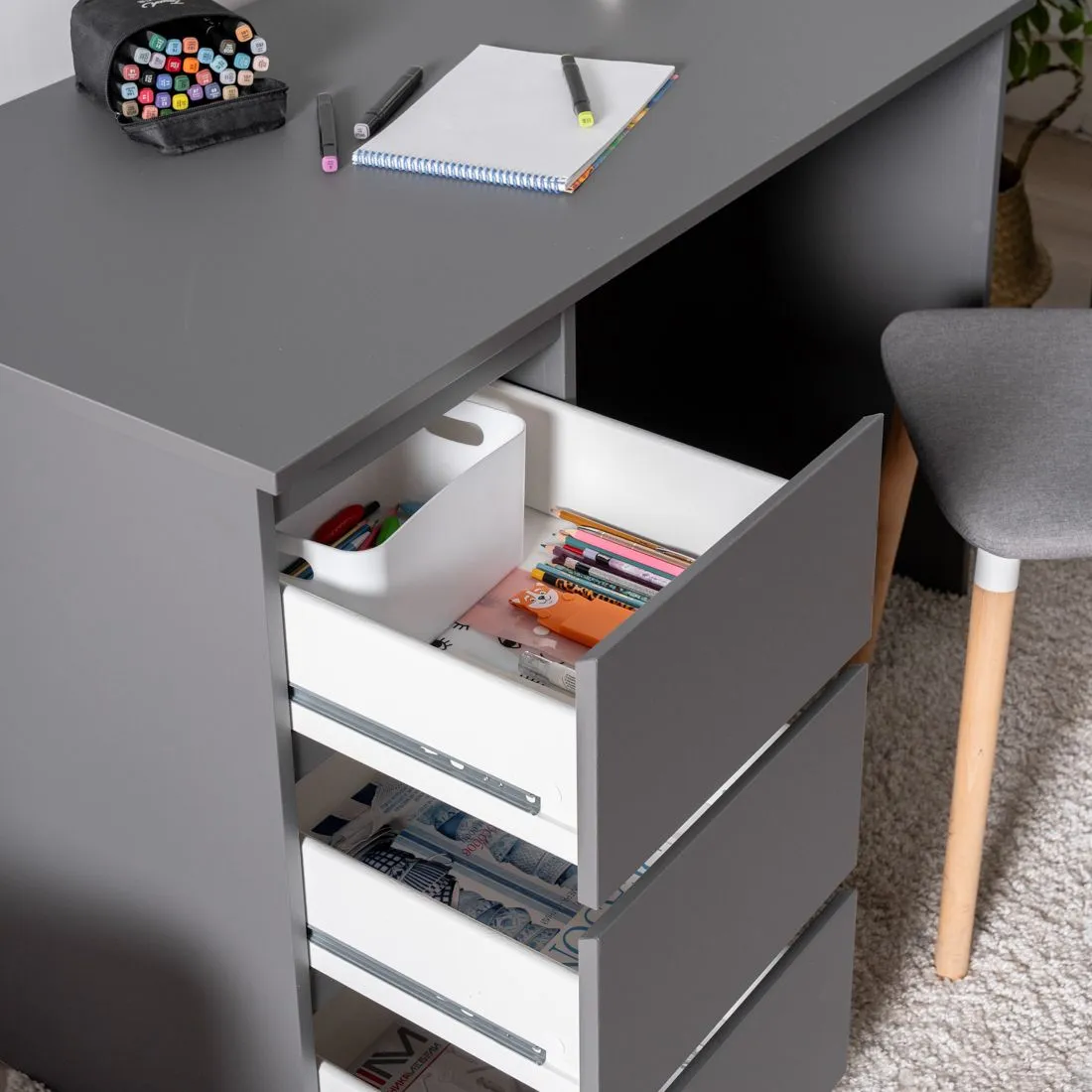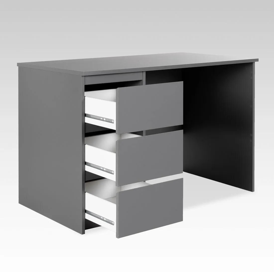 Стол письменный КАСТОР с тремя наружными выдвижными ящиками, 1510х650х750, цвет Серый. Изготовлен из кашированного ДСП толщиной  16 мм. Тумбу с ящиком можно разместить справа или слева под столешницей. Гарантийный срок для жилых помещений 24 месяца, для общественных помещений - 18 месяцев.