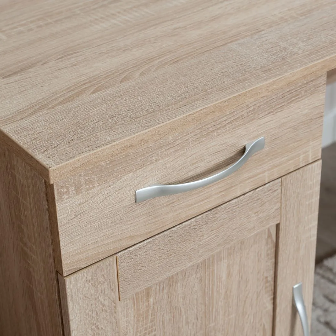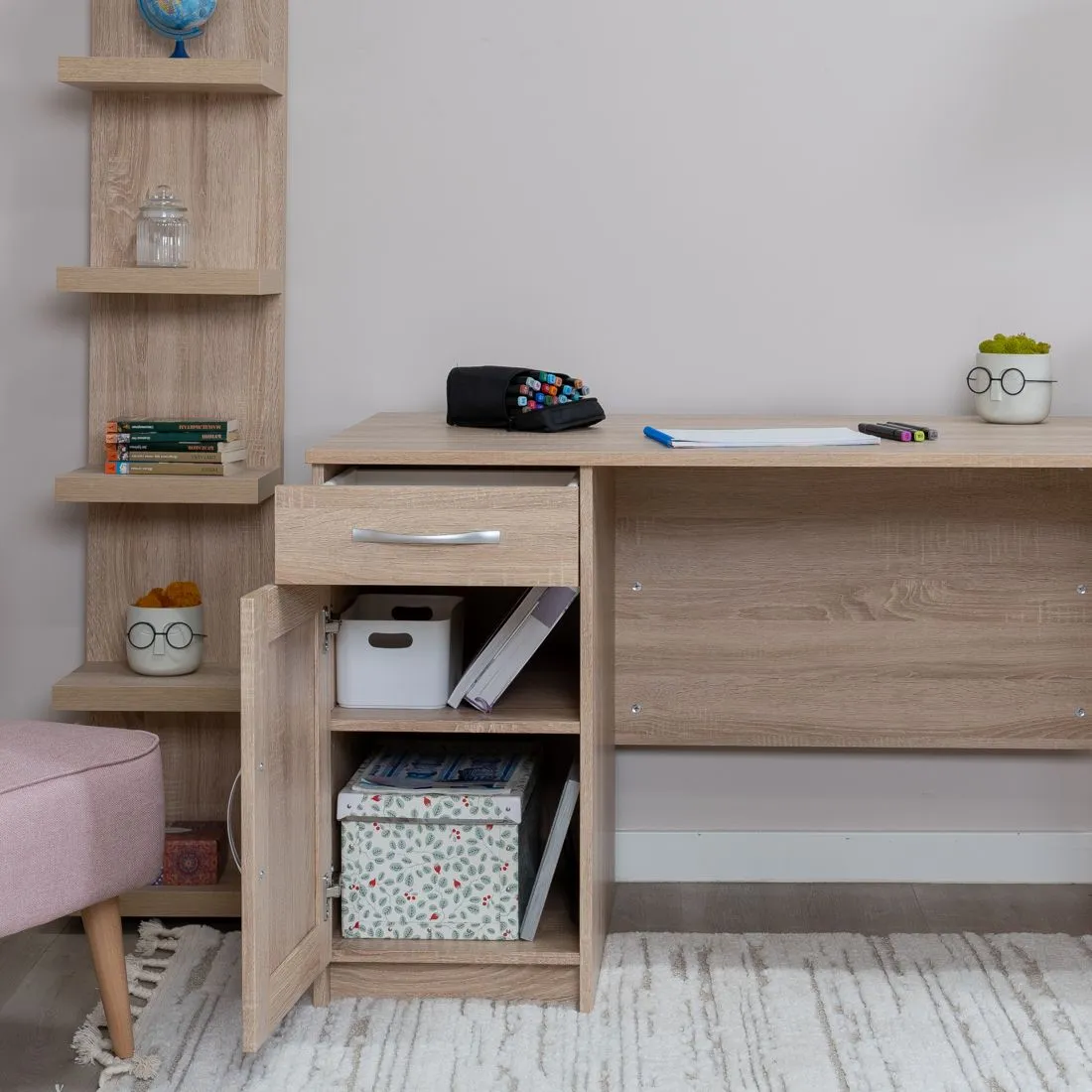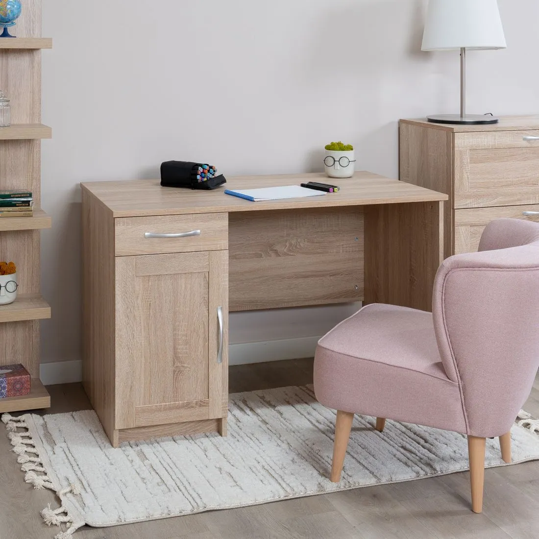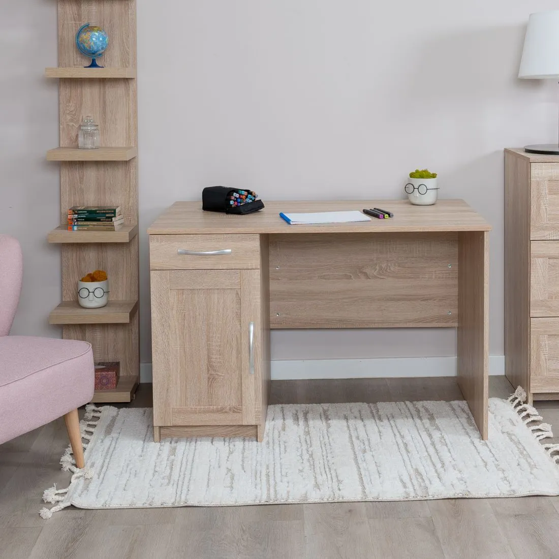 Стол письменный КАСТОР с тумбой и наружным выдвижным ящиком, 1156х650х750, цвет Дуб Сонома. Изготовлен из кашированного ДСП толщиной 16 мм. Тумбу с ящиком можно разместить справа или слева под столешницей. Гарантийный срок для жилых помещений 24 месяца, для общественных помещений - 18 месяцев.