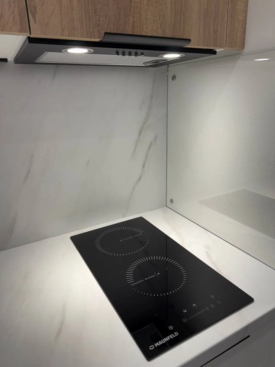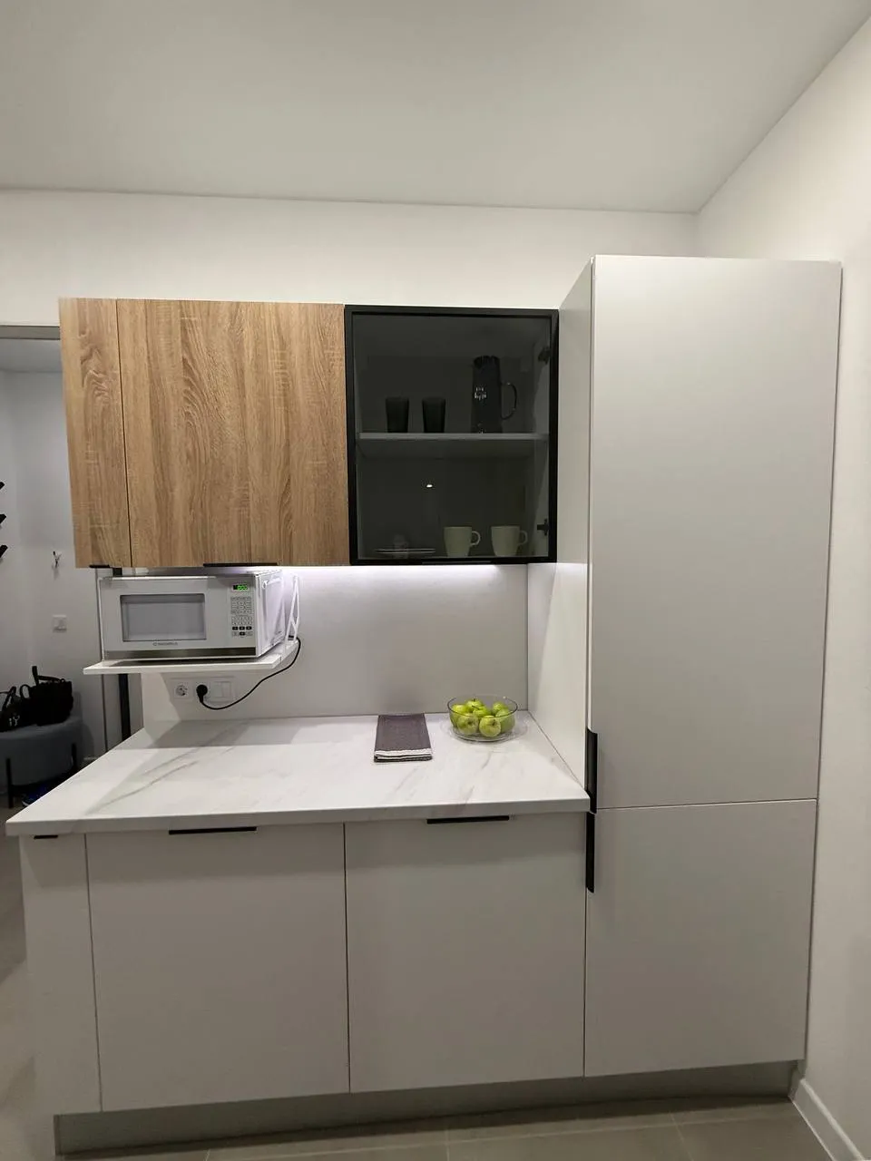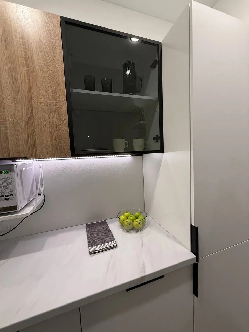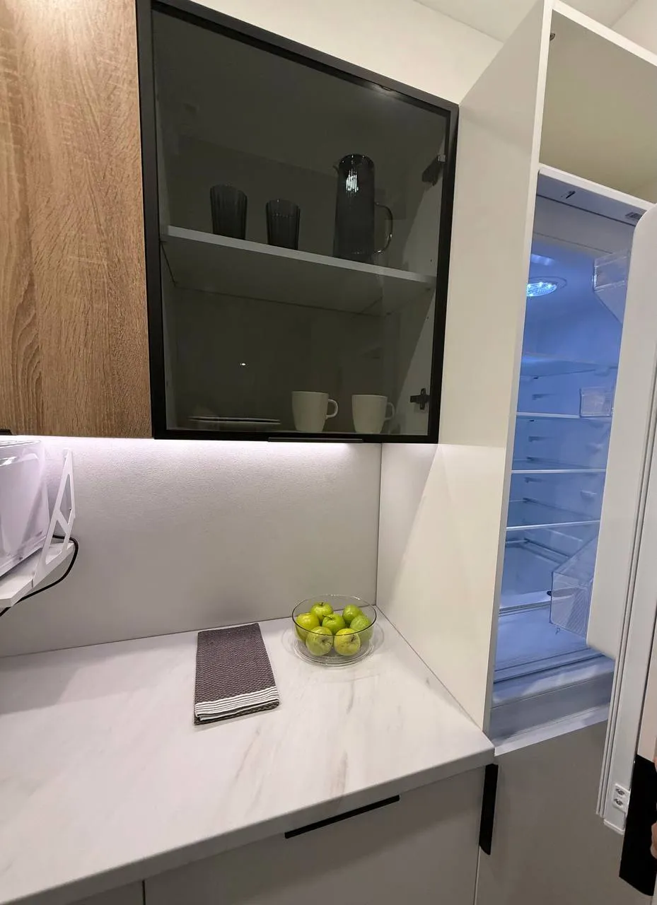 Встроенная бытовая техника: мы подобрали и установили все необходимое — холодильник, варочную панель, вытяжку, микроволновую печь, а также телевизор и чайник.
